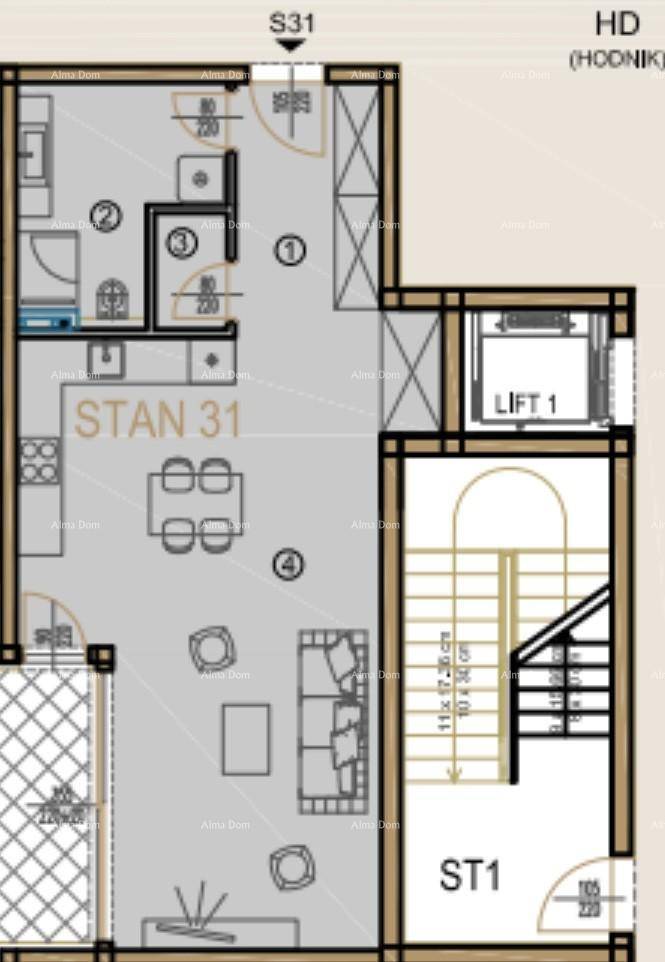 Stan S31 nalazi se na prvom katu i sastoji se od hodnika s garderobom, kupaonice, dnevnog boravka s kuhinjom i blagovaonicom te loggie.