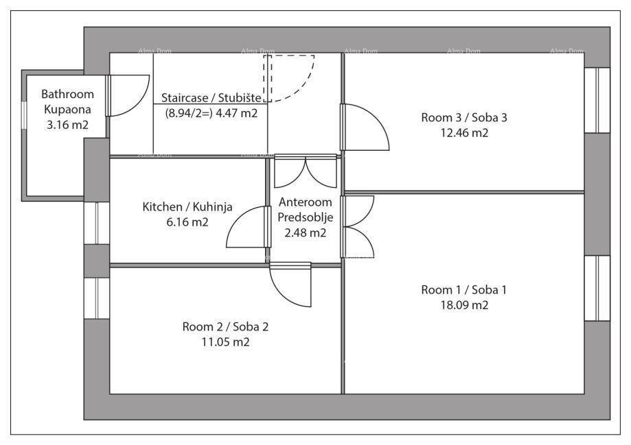 Stan trenutno nema dnevni boravak, jedna od spavaćih soba lako se može prenamijeniti u dnevni prostor, ovisno o potrebama budućeg vlasnika.