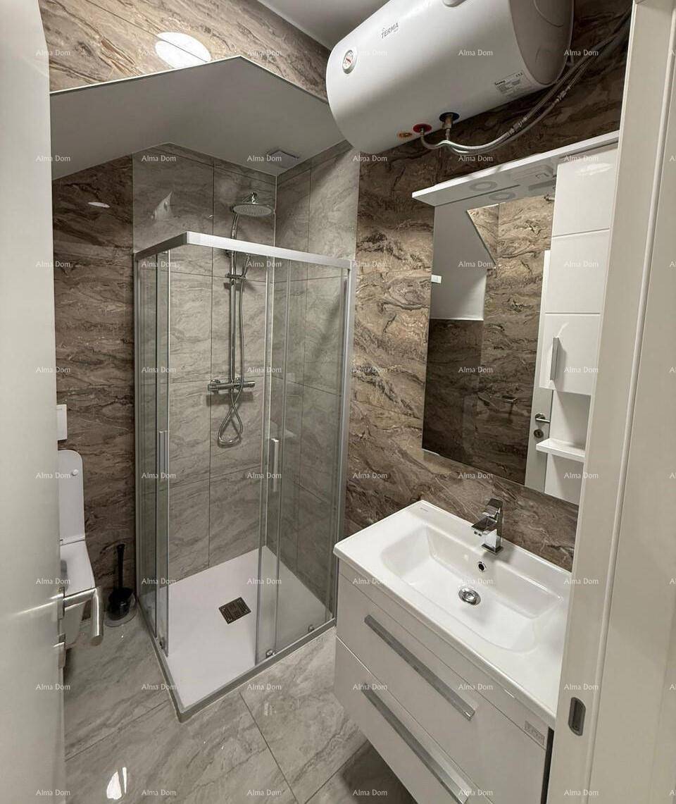 U prizemlju se nalaze ulazni hodnik, spremište, kupaonica te dnevni boravak. Na prvom katu smještene su dvije spavaće sobe, svaka s vlastitom kupaonicom. Na drugom katu nalazi se prostrani dnevni boravak s visokim stropovima, dok je na galeriji dodatna spavaća zona s dva kreveta – idealno za djecu ili goste. Iz dnevnog boravka se izlazi na veliku terasu od 30 m² s očaravajućim pogledom na more.