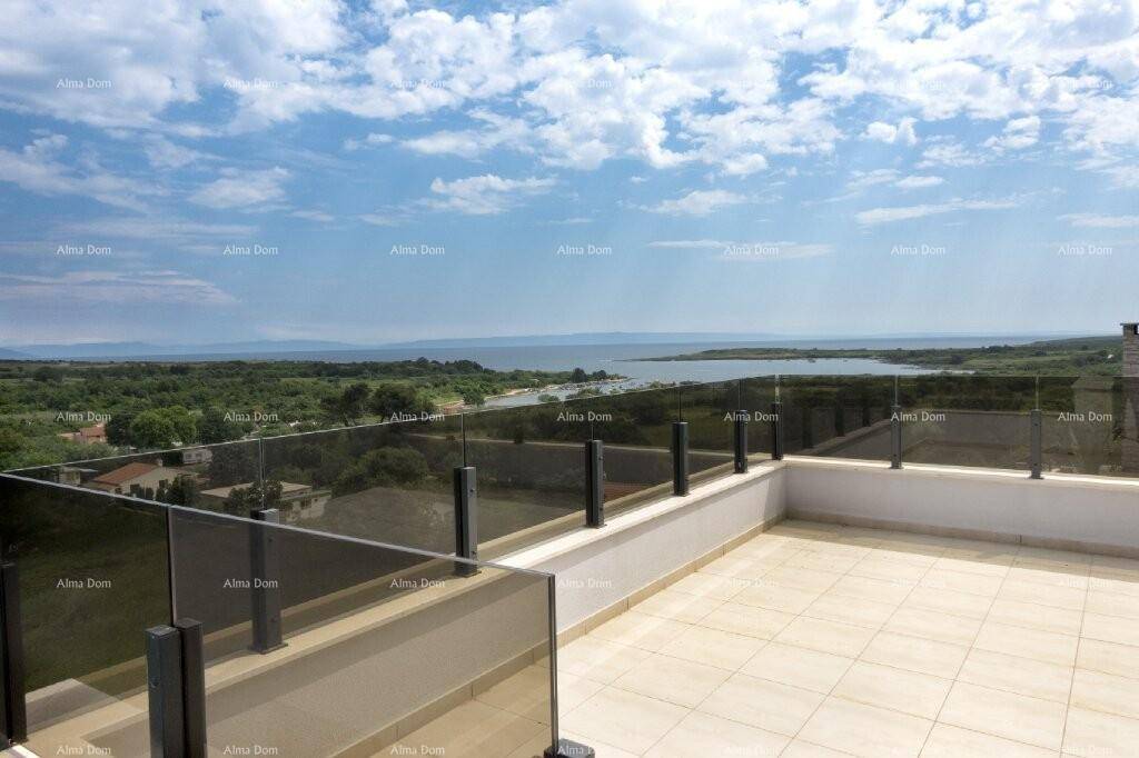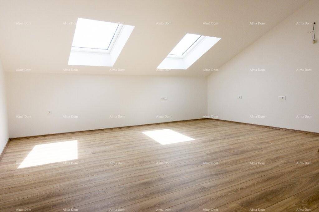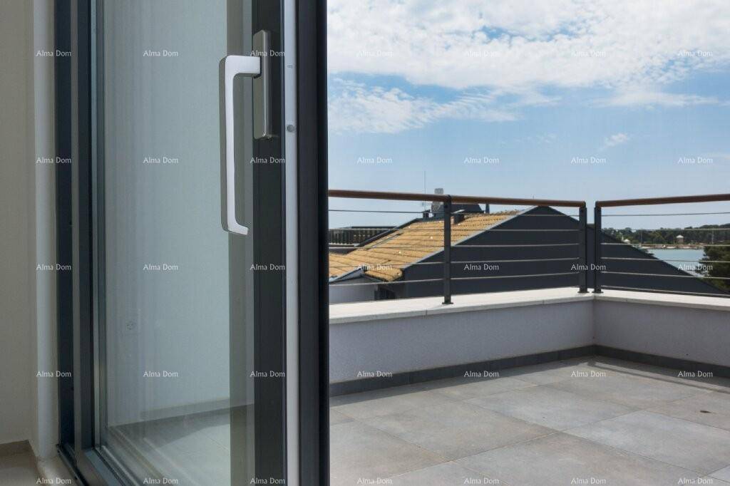 Dvoetažni Penthause nalazi se na 3. katu objekta u PREMIUM BLUE ZONI sa galerijom i pogledom na more i grad Poreč. Sastoji se od dnevnog boravka sa kuhinjom i blagovaonicom, dvije spavaće sobe, dvije kupaonice, lođe i krovne terase kao dio galerije.