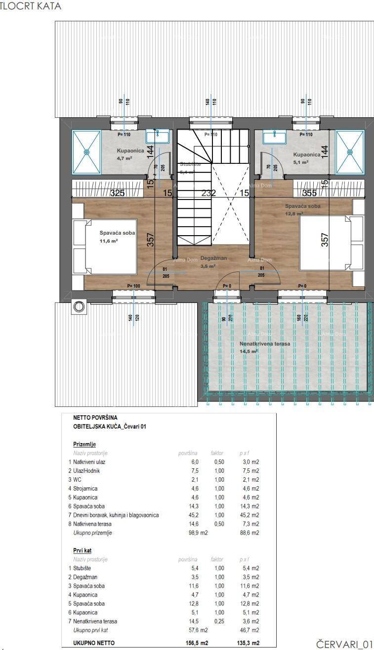Vila, površine od 156.5 m² sastoji se od: stubišta, 2 spavaće sobe, 2 kupaonice i nenatkrivene terase.