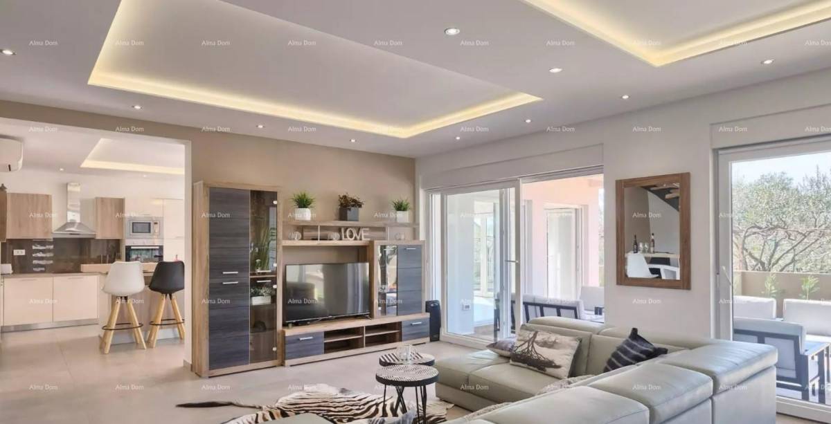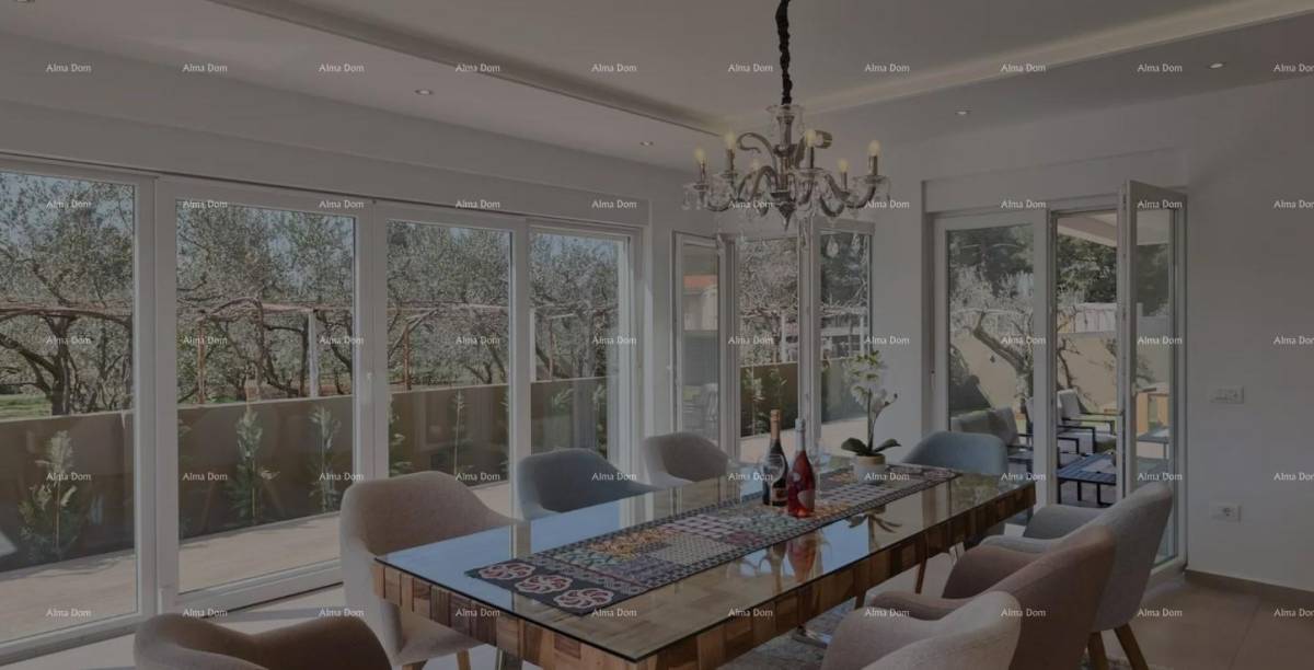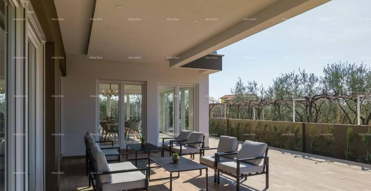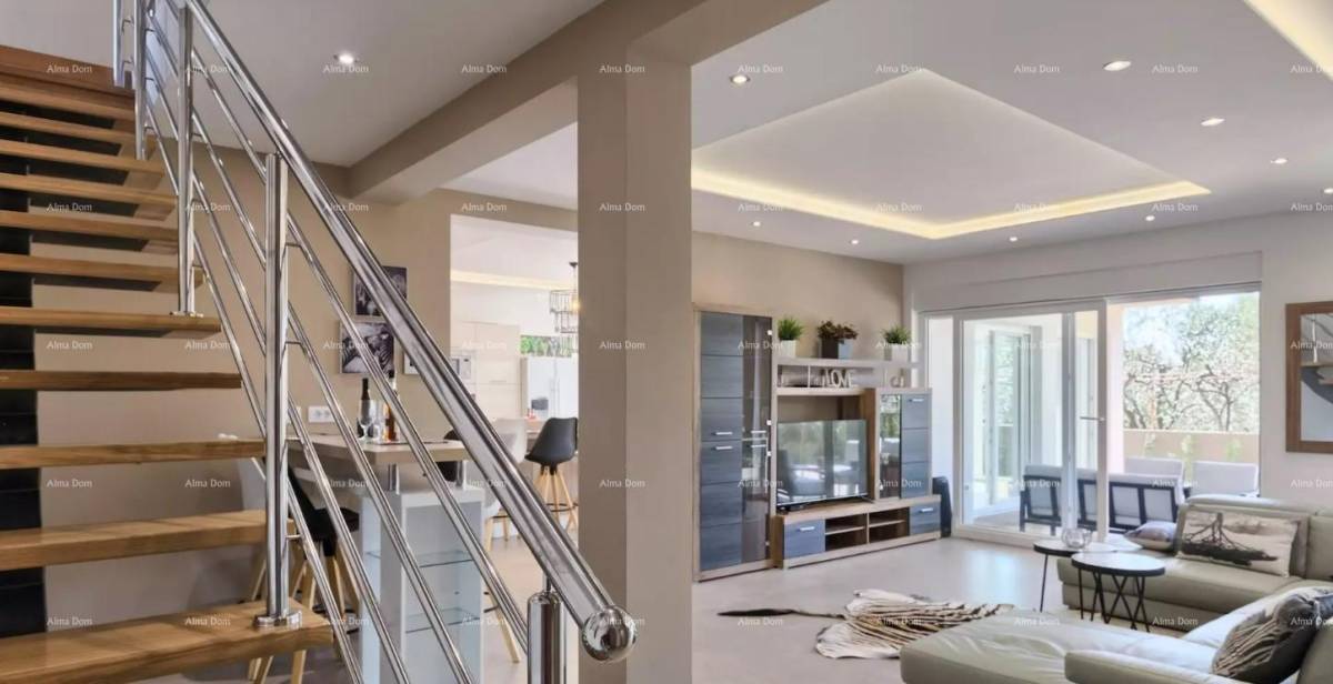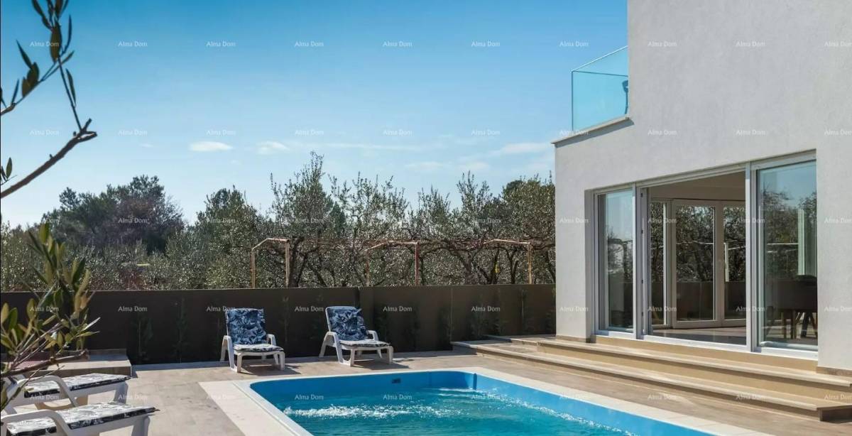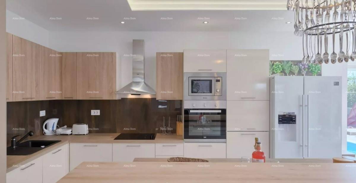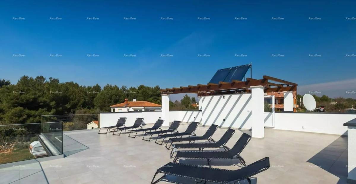 Grad Fažana nalazi se na jugozapadnoj obali istarskog poluotoka, s pogledom na more i prekrasne otoke Brionskog otočja. Nalazi se samo 8 km od Pule. U blizini antičkih ruševina Pule, Fažana i Valbandona. Imanje se nalazi u mirnom privatnom selu samo 700m od mora i samo 700m od centra Fažana i njegove prekrasne šetnice. Prostire se na prizemlju i prvom katu, ukupne stambene površine 300 četvornih metara. U prizemlju se nalazi prostran i lijepo uređen dnevni boravak povezan s modernom kuhinjom, blagovaonicom i kupaonicom. Visokokvalitetni materijali, puno prirodnog svjetla i jedinstveni lusteri čine ovaj dio kuće posebnim i ugodnim. Na katu se nalaze četiri spavaće sobe, svaka sa svojom kupaonicom i prostranom terasom s neprekidnim pogledom na more i Brione. Posebnost ove nekretnine je krovna terasa na kojoj se krije 10 ležaljki, pogledi oduzimaju dah! Parcela od 223 m² ima privatni bazen, terasu za sunčanje i zelenilo s vanjskim stolovima i klupama. Bogato područje, parking za nekoliko automobila. Idealna investicija za miran obiteljski život ili kao investicija za turistički najam uz solidan povrat uloženog!