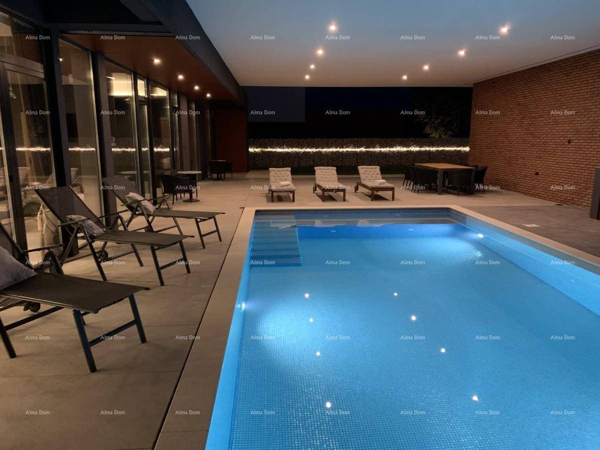 U večernjim satima moderna rasvjeta baca decentno svijetlo na cijelu vilu i vrt.