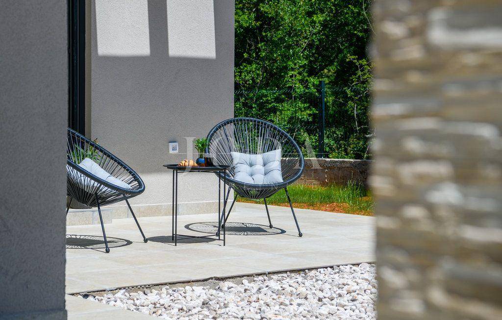 Iz dnevnog boravka se kroz velike staklene stijene izlazi se na prostranu natkrivenu terasu uz koju se nalazi bazen sa sunčalištem i uređen travnjak.