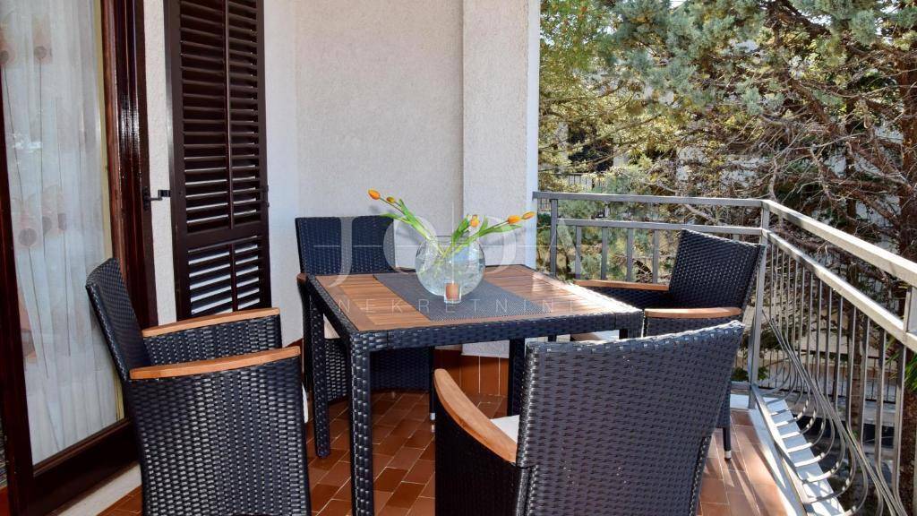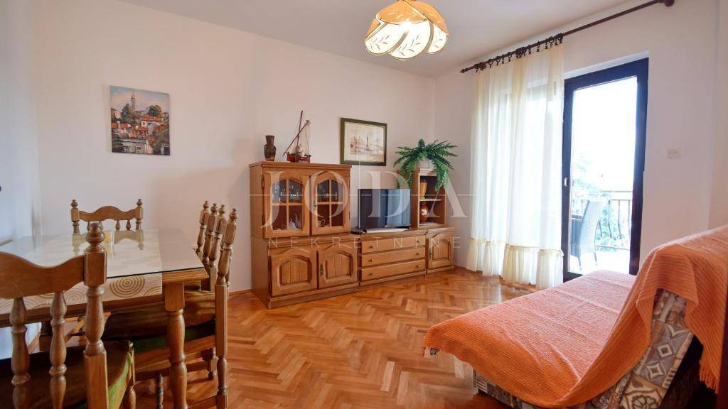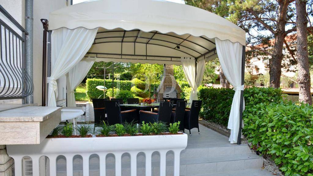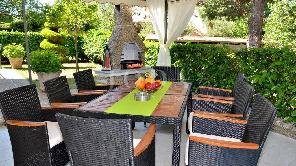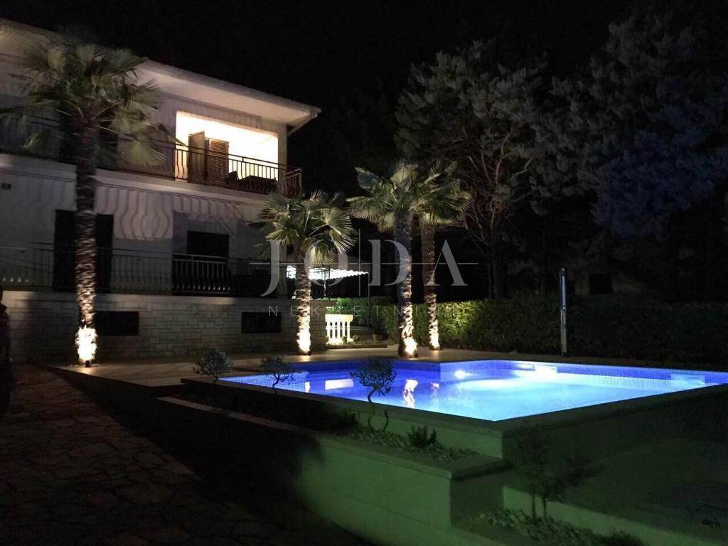 Kuća je stambene površine 150m2 i pripada joj 577m2 okućnice. Sastoji od suterena, prizemlja i kata te dvije stambene jedinice. U suterenu se nalaze terasa i ljetna kuhinja. U prizemlju i na prvom katu su dva identična stana - sastoje se od dnevnog boravka, kuhinje i blagavaonice, dvije spavaće sobe, kupaonice i dodatnog toaleta i površina im je cca 60m2. Stanovi imaju odvojene ulaze. Na okućnici se nalazi bazen i više parkirnih mjesta. Nekretnina je renovirana 2018. godine. Nalazi se na izvrsnoj lokaciji, udaljena cca 500m od prve plaže. Nekoliko godina se uspješno iznajmljuje u turističke svrhe stoga je potencijalno odlična investicija.