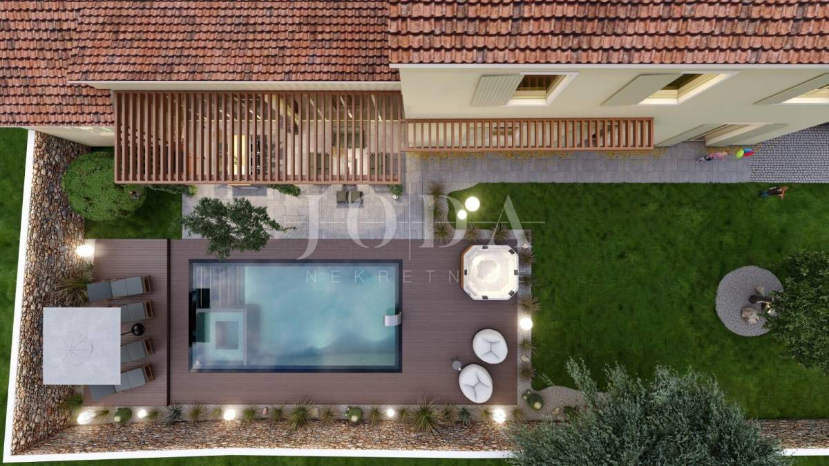 Vanjski prostori vile jednako su impresivni, s nekoliko natkrivenih i nenatkrivenih terasa koje pružaju dovoljno prostora za objedovanje na otvorenom, odmaranje i upijanje sunca. Središnji dio vanjskog prostora je predviđen za privatni bazen, veličine 10x5metara, savršen za osvježavajuće kupanje u vrućim ljetnim danima ili jednostavno uživanje u danu na suncu. Za dodatni doživljaj ugode, topla finska sauna podići će vaš užitak. Vrt je pažljivo njegovan i krasi ga mnoštvo mediteranskih biljaka i drveća, stvarajući skladan spoj prirode i arhitekture.