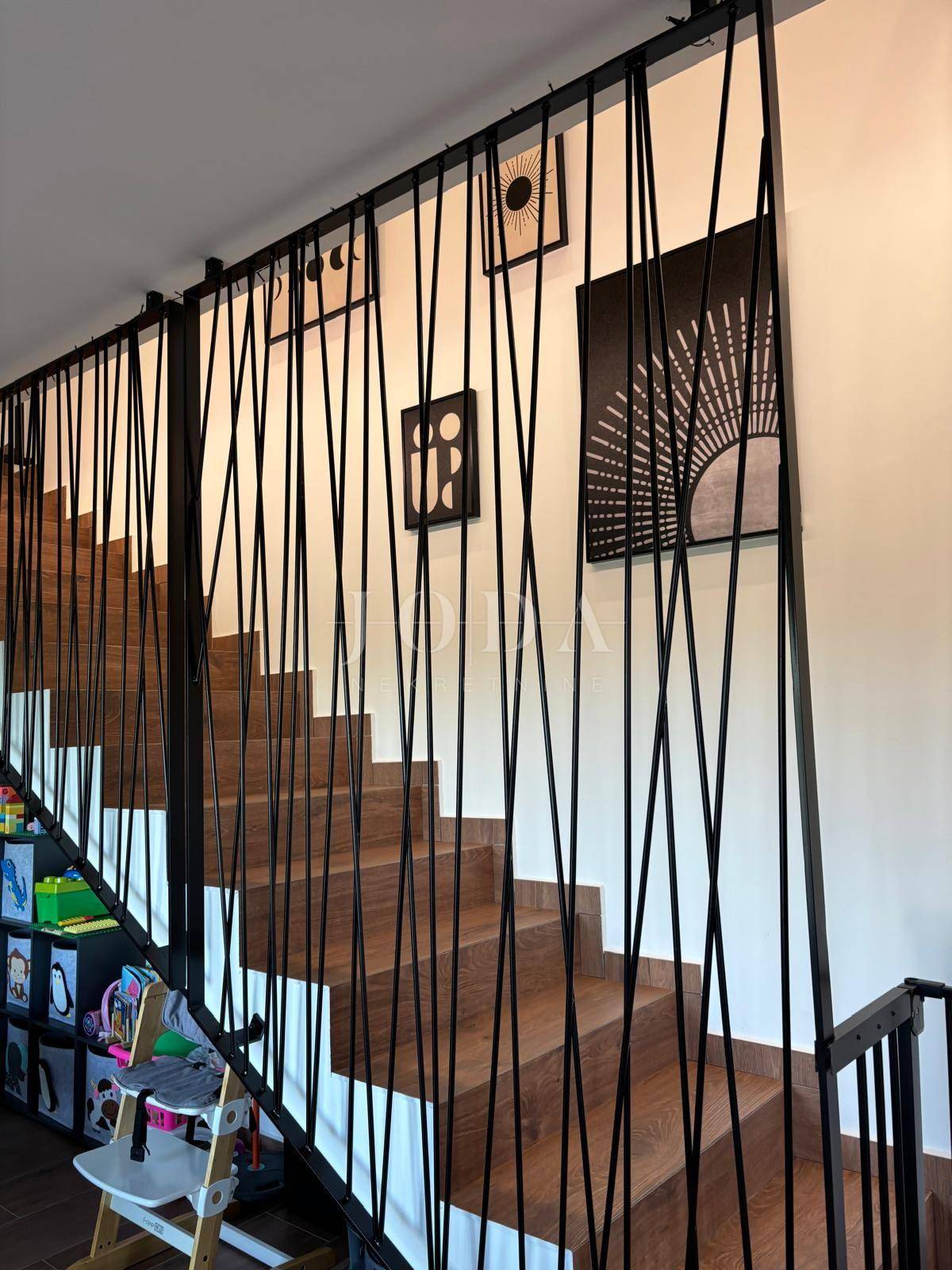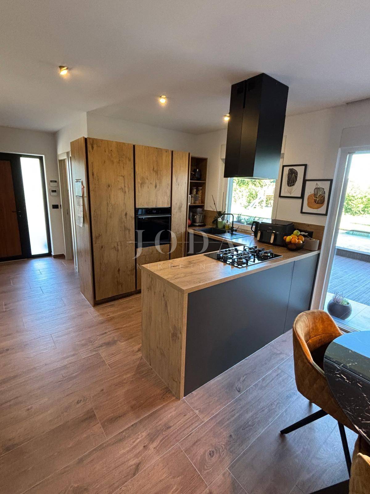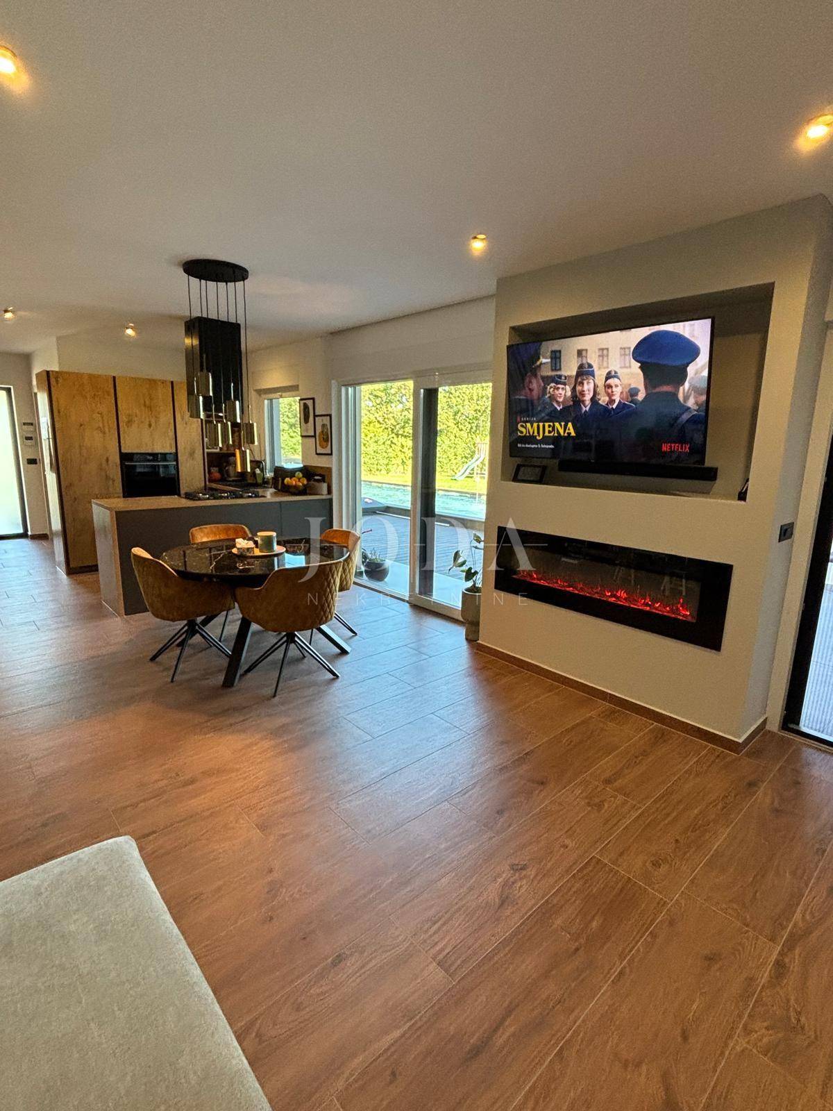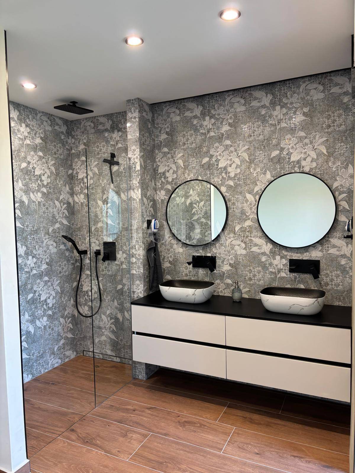 Ispred vile prostran parking te dizajnerski osvijetljen ulaz vodi nas u open space dnevni boravak,kuhinju i blaovaonu.
