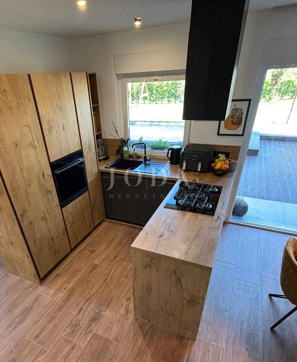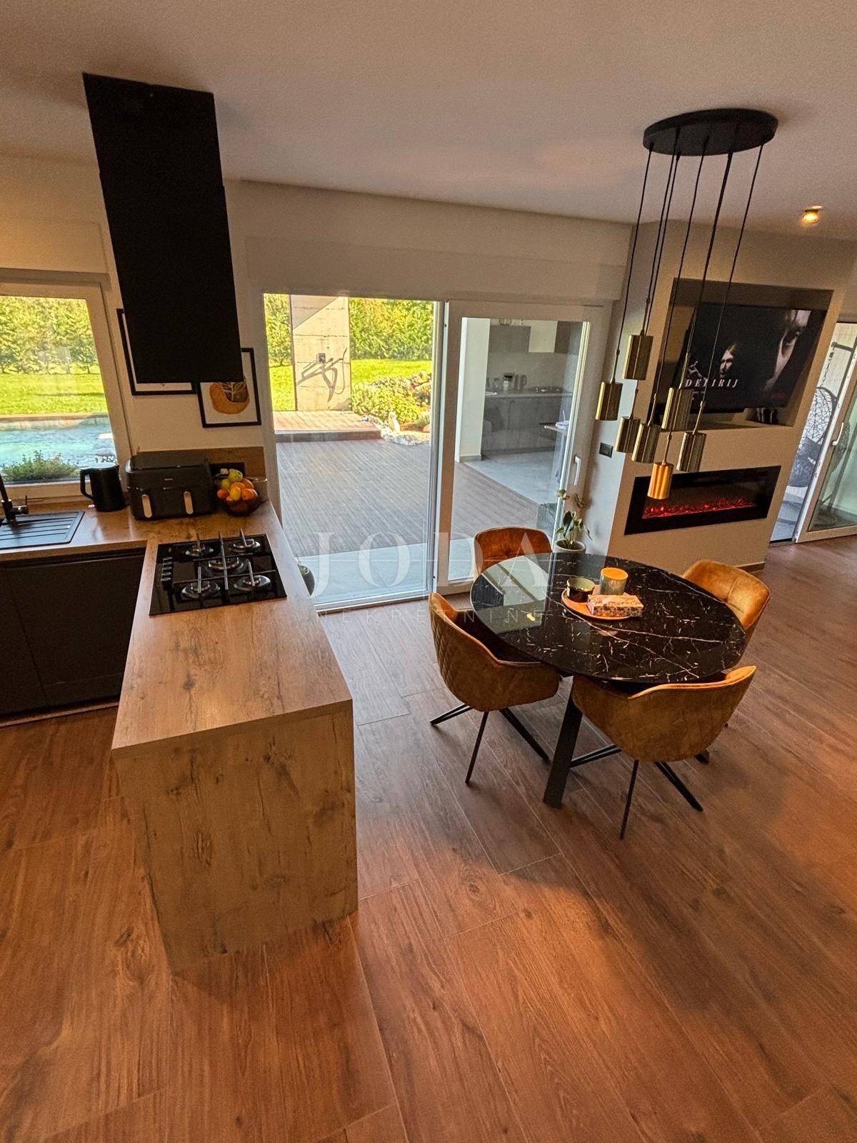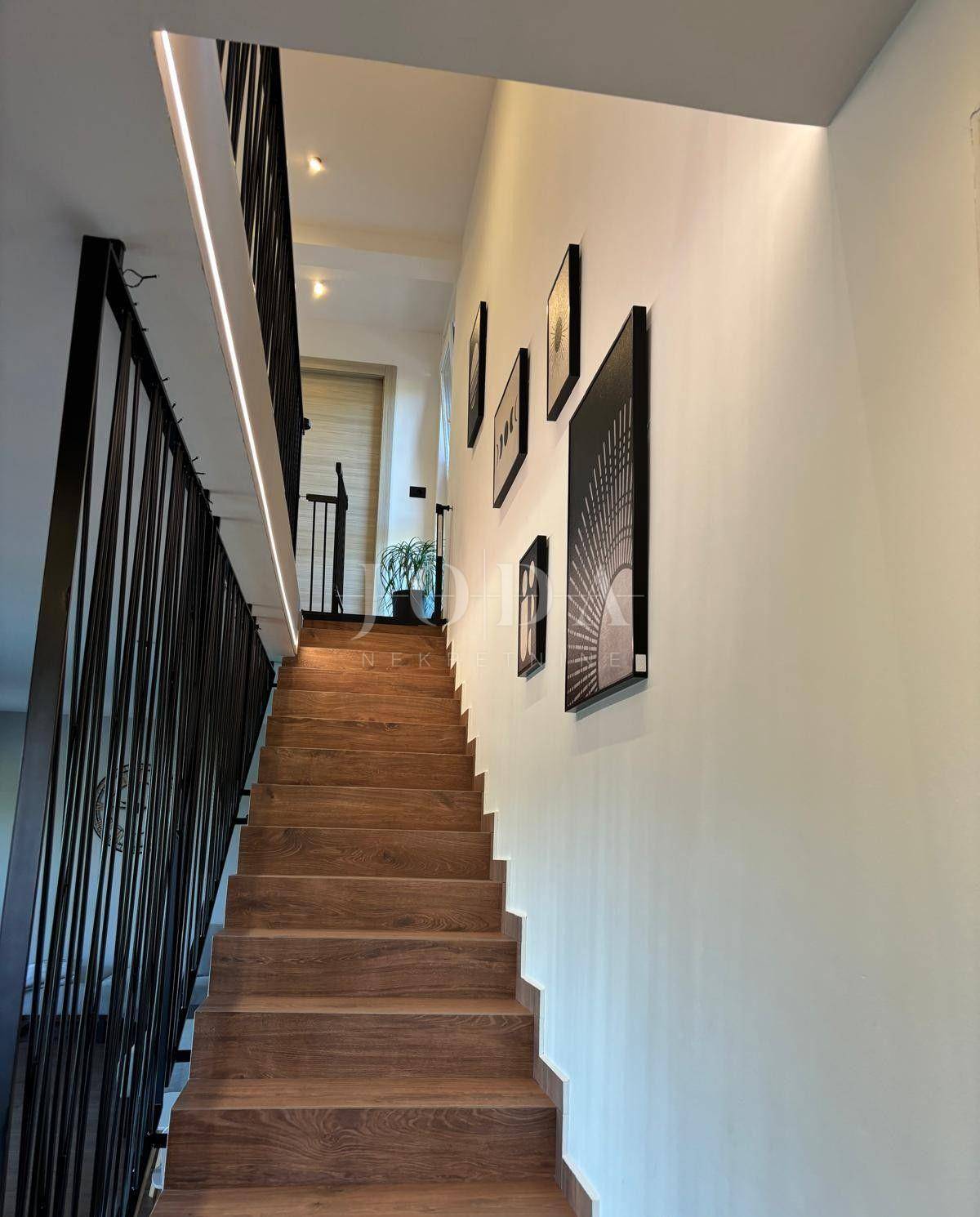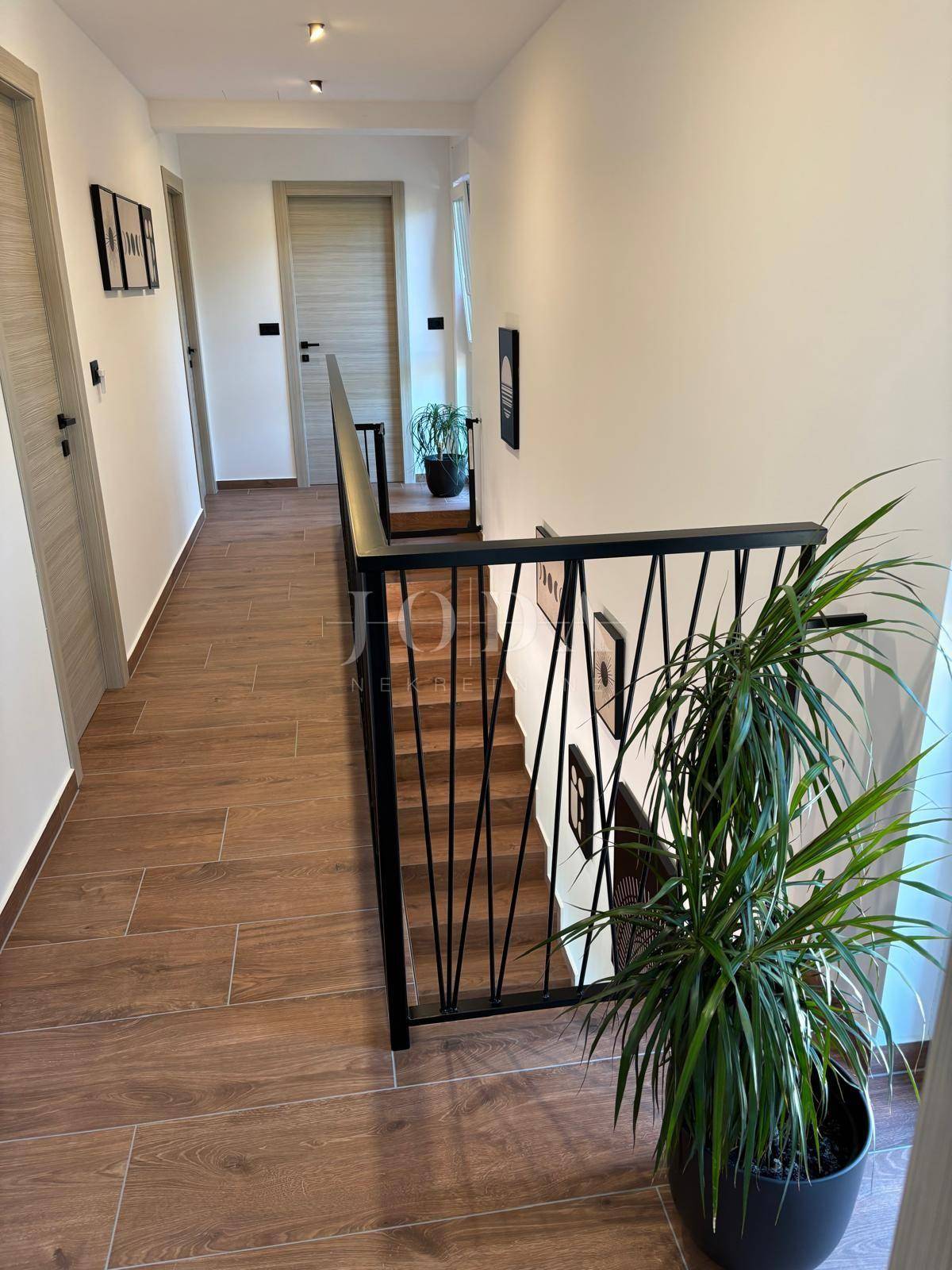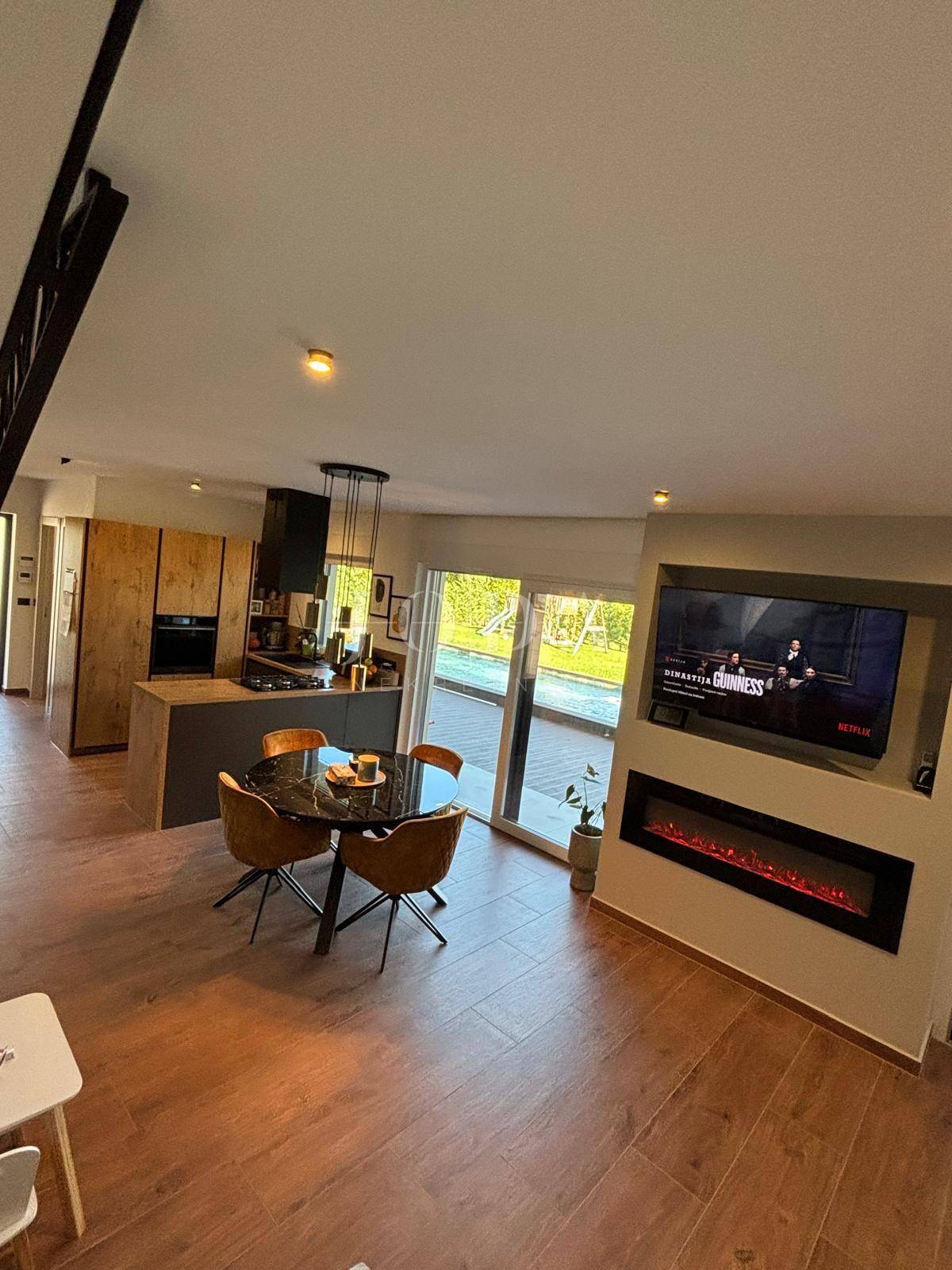 Ispred vile prostran parking te dizajnerski osvijetljen ulaz vodi nas u open space dnevni boravak,kuhinju i blaovaonu.