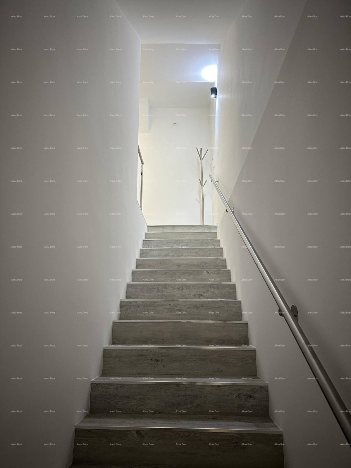 Stepenice vode na kat gdje se nalazi predprostor, hodnik, dnevni prostor s blagavaonom, kuhinja, 3 spavaće sobe, 2 kupaone i balkona.