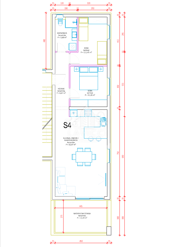 - dnevni dio s kuhinjom, blagovaonicom i boravkom (33,00 m²)