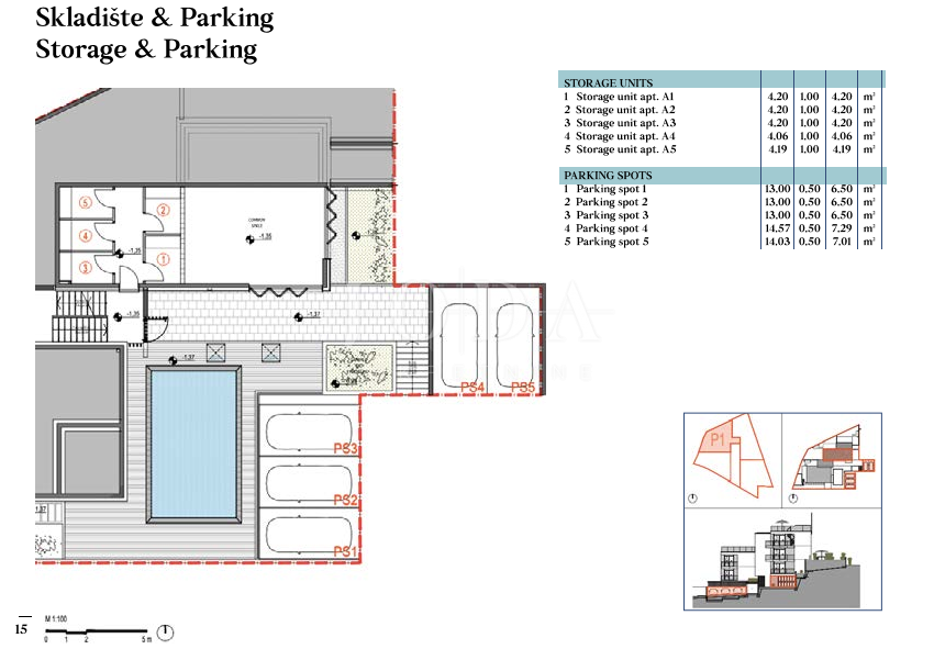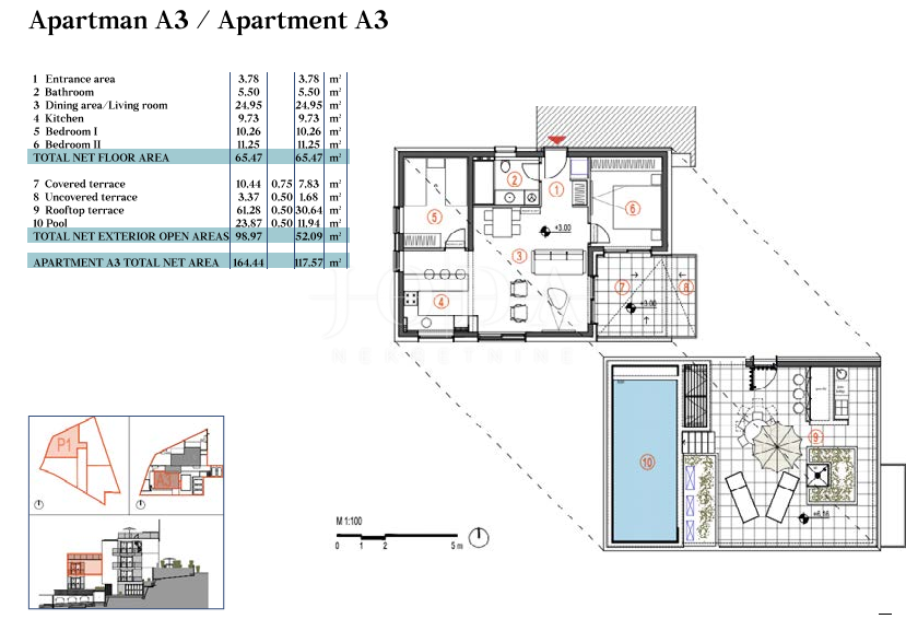 Na atraktivnoj lokaciji u Primoštenu prodaje se prostran apartman oznake P1 A3, savršen za miran i luksuzan odmor uz more. Apartman se sastoji od ulaznog hodnika, potpuno opremljene kuhinje, otvorenog dnevnog boravka s blagovaonicom te dvije spavaće sobe i kupaonice. Poseban naglasak stavljen je na vanjski prostor – natkrivenu i nenatkrivenu terasu, prostranu krovnu terasu s panoramskim pogledom te privatni bazen sa sunčalištem. Uz stan dolaze i ostava te vlastito parkirno mjesto, što dodatno osigurava praktičnost i udobnost.