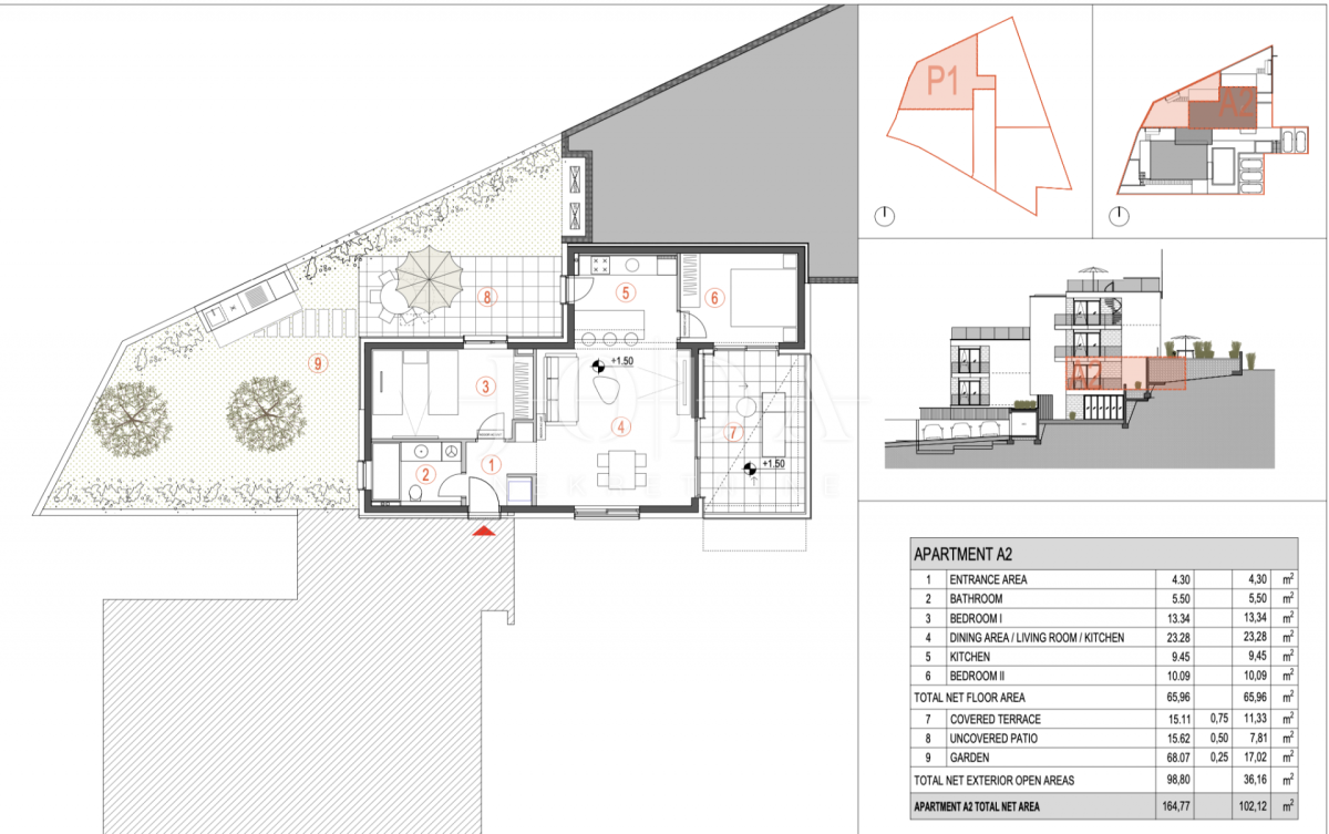 Na atraktivnoj lokaciji u Primoštenu prodaje se prostran i elegantno uređen apartman oznake P1 A2, savršen za miran odmor u blizini svih važnih sadržaja. Apartman se sastoji od ulaznog hodnika, potpuno opremljene kuhinje, prostranog dnevnog boravka s blagovaonicom, dvije spavaće sobe i kupaonice. Dodatno nudi ljetnu kuhinju, natkrivenu i nenatkrivenu terasu, ograđeni vrt, privatni bazen sa sunčalištem i ležaljkama, a uz stan dolaze i ostava te vlastito parkirno mjesto.