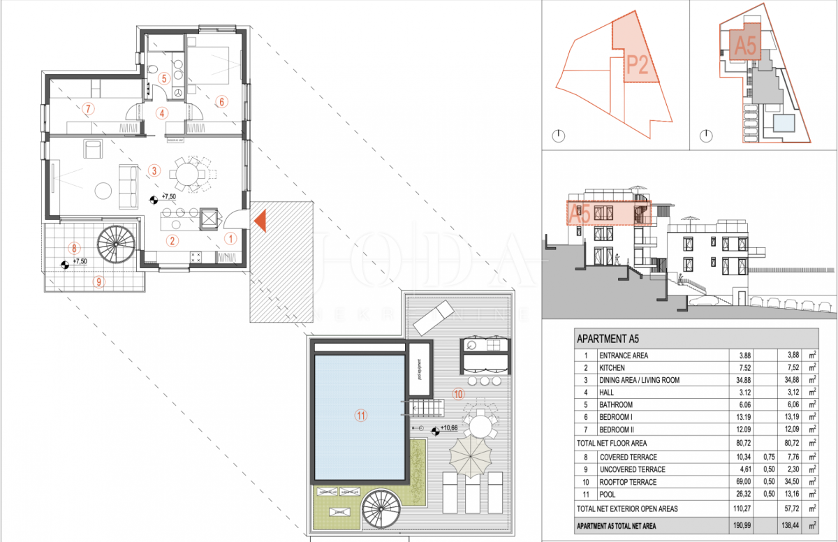 Na atraktivnoj lokaciji u Primoštenu prodaje se prostran apartman oznake P2 A5, osmišljen za luksuzan i opuštajući boravak na Jadranu. Apartman se sastoji od ulaznog hodnika, potpuno opremljene kuhinje, velikog dnevnog boravka s blagovaonicom, dvije spavaće sobe i kupaonice. Vanjski prostor pruža ljetnu kuhinju, natkrivenu i nenatkrivenu terasu, ograđeni vrt te privatni bazen sa sunčalištem i ležaljkama. Uz stan pripadaju i ostava te vlastito parkirno mjesto.