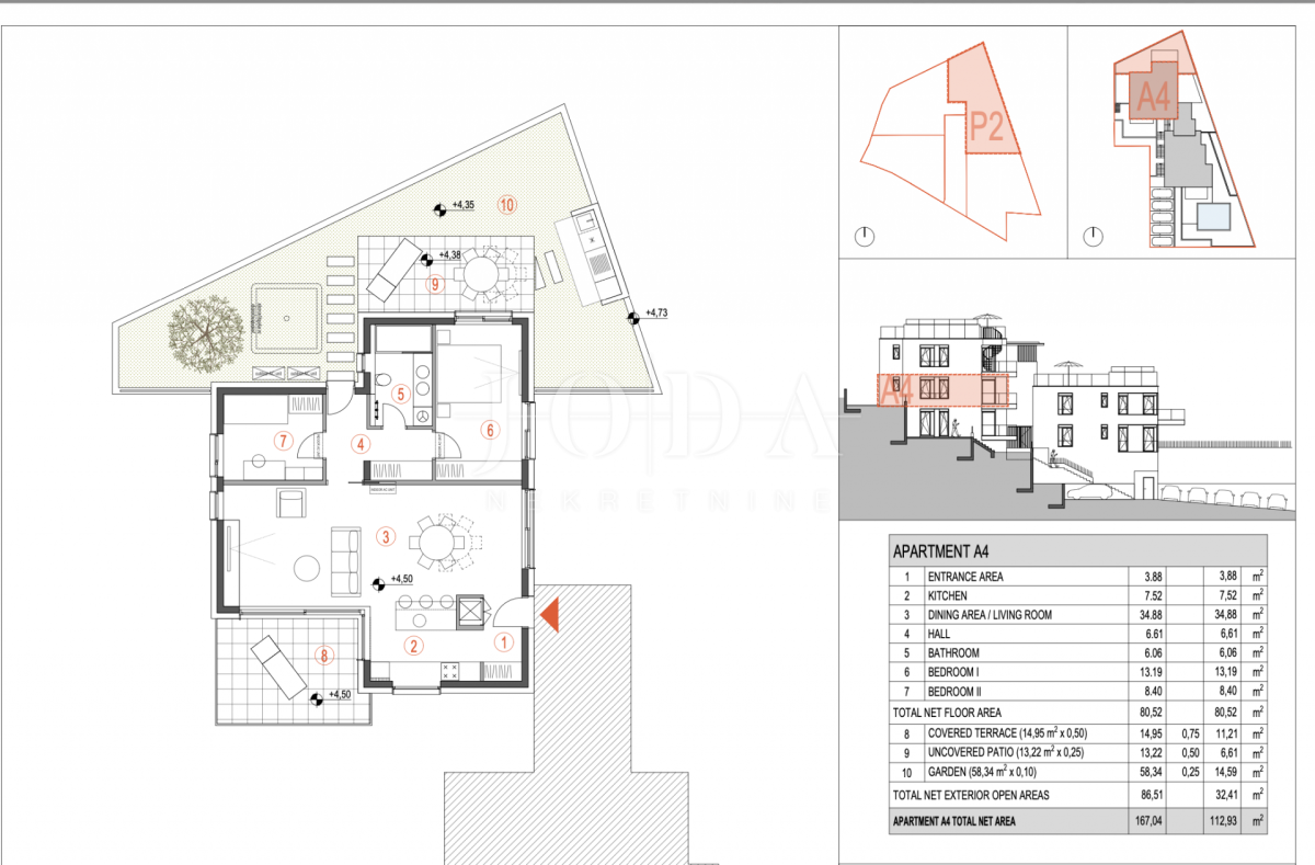 U mirnom dijelu Primoštena, a ujedno u blizini svih važnih sadržaja, prodaje se moderan apartman oznake P2 A4, idealan za luksuzan i opuštajući odmor. Apartman se sastoji od ulaznog hodnika, potpuno opremljene kuhinje, prostranog dnevnog boravka s blagovaonicom, dvije spavaće sobe i kupaonice. Vanjski prostor uključuje ljetnu kuhinju, natkrivenu i nenatkrivenu terasu, ograđeni vrt te privatni bazen sa sunčalištem i ležaljkama. Uz apartman pripadaju i ostava te vlastito parkirno mjesto, što osigurava dodatnu udobnost.