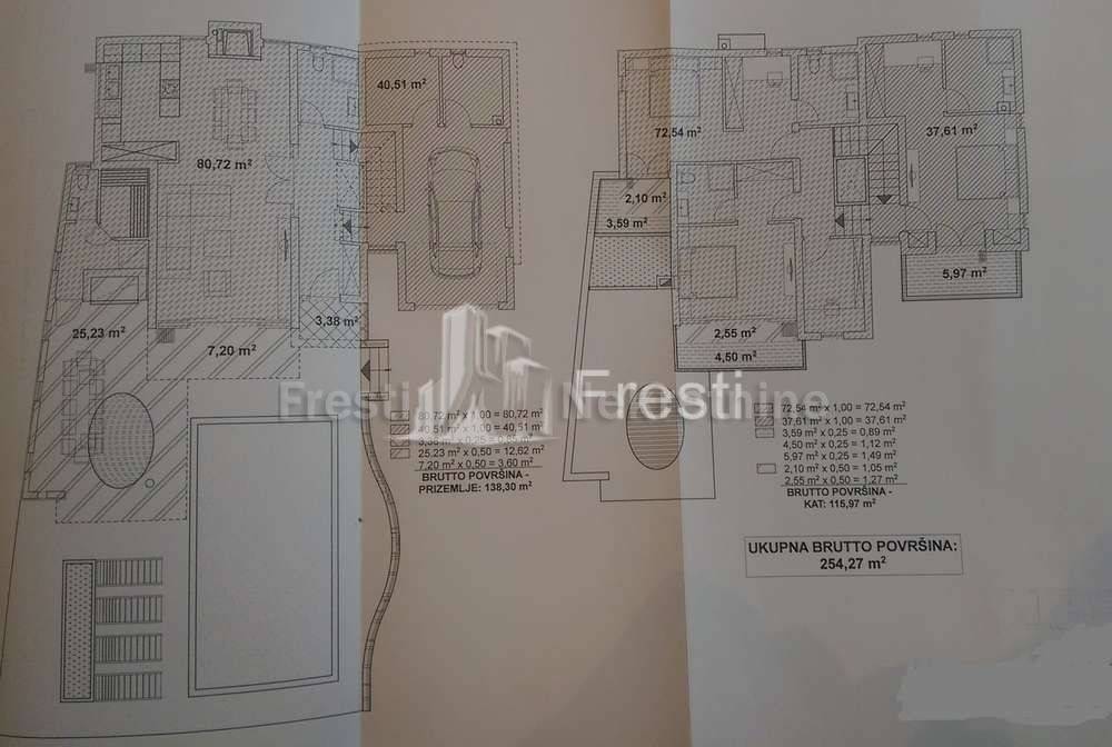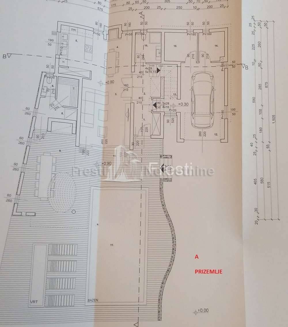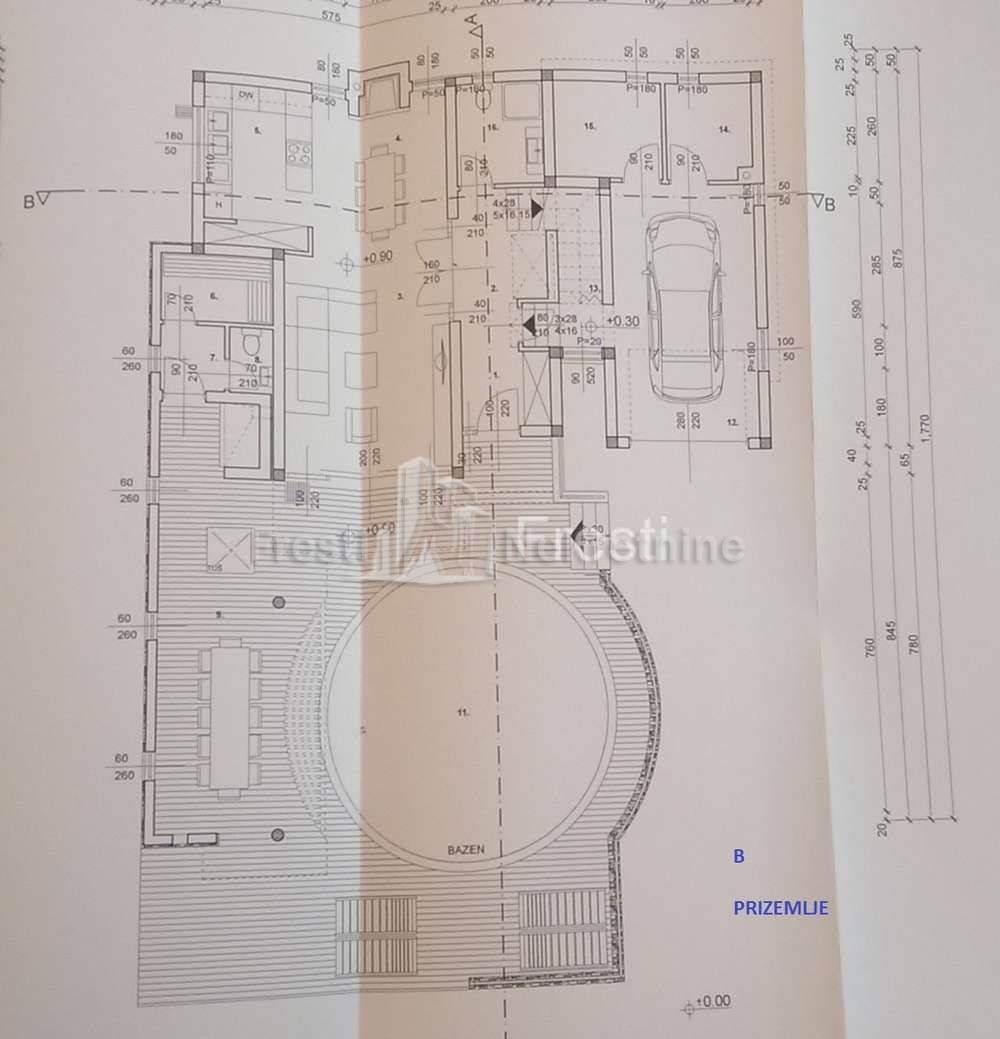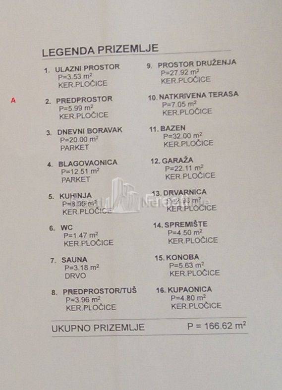 PRIZEMLJE (166,62 m2):predprostor (5.99 m2), kuhinja (8.99 m2), blagovaonica (12.50 m2),kupaonica (4.80 m2), sauna (3.18 m2), prostor za druženja (27.92 m2),natkrivena terasa (7.05 m2), bazen (32 m2), garaža (22 m2),drvarnica (2.98 m2), spremište (4.50 m2), konoba (5.63 m2), WC (1.47 m2),