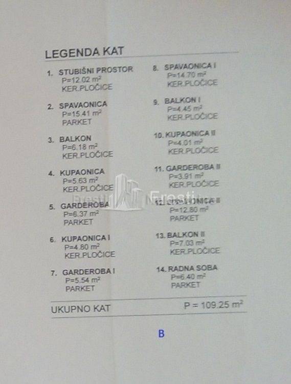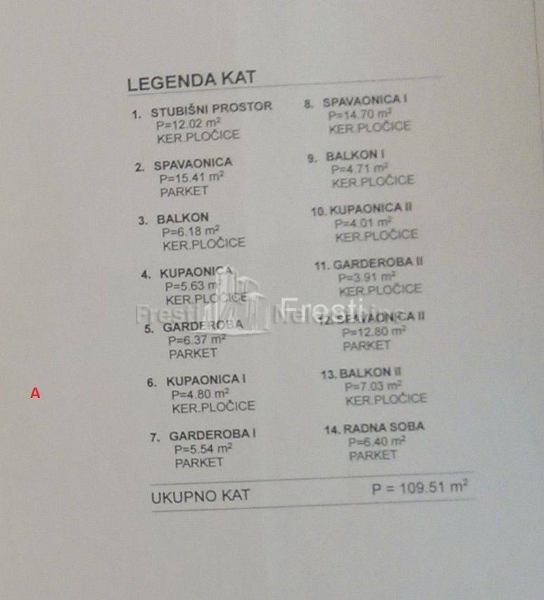 1. KAT (109.51 m2):stubište (12.02 m2), radna soba (6.40 m2),spavaća sobe (15.41 m2), garderoba (6.73 m2), kupaonica (5.63 m2), balkon (6.18 m2),spavaća soba I (14.70 m2), garderoba I (5.54 m2), kupaonica I (4.80 m2), balkon I ( 4.71 m2),spavaća soba II (12.80 m2), garderoba II (5.54 m2), kupaonica II (3.91 m2), balkon II ( 7.03 m2)