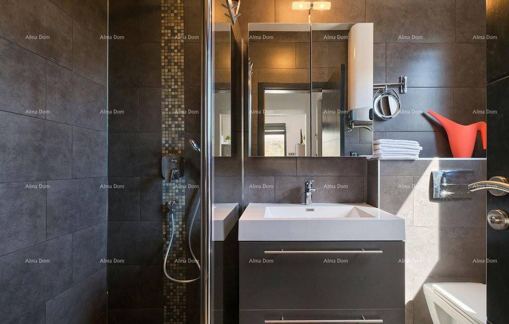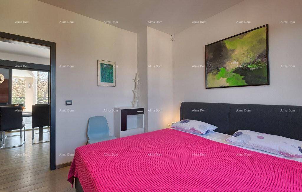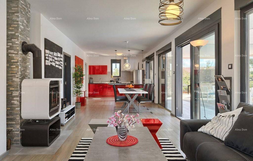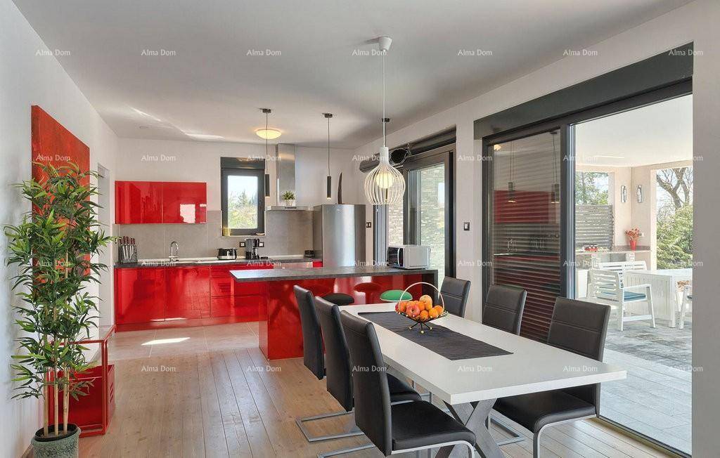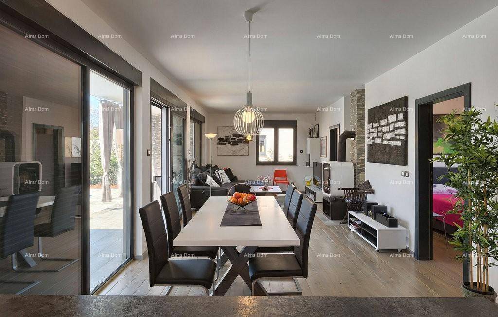 Velika staklena stijena za izlaz na natkrivenu terasu od cca 40 m2 te veliki bazen 32 m2.
