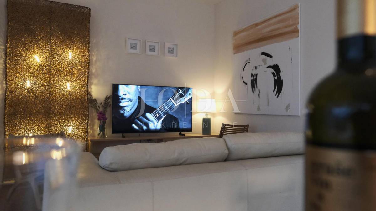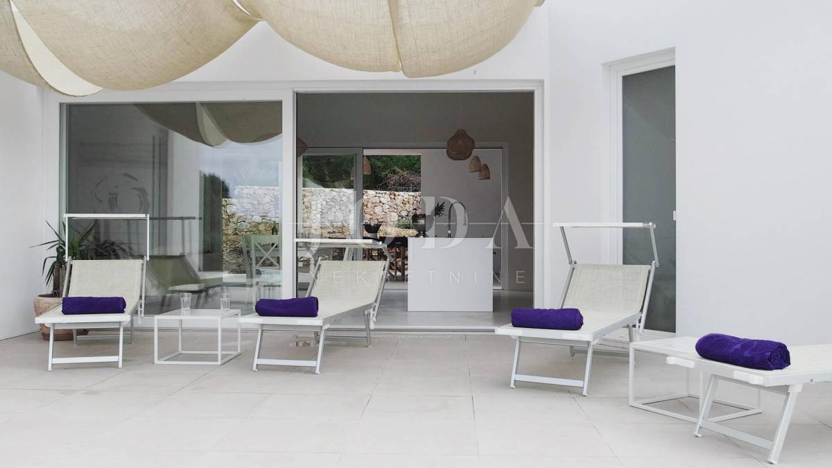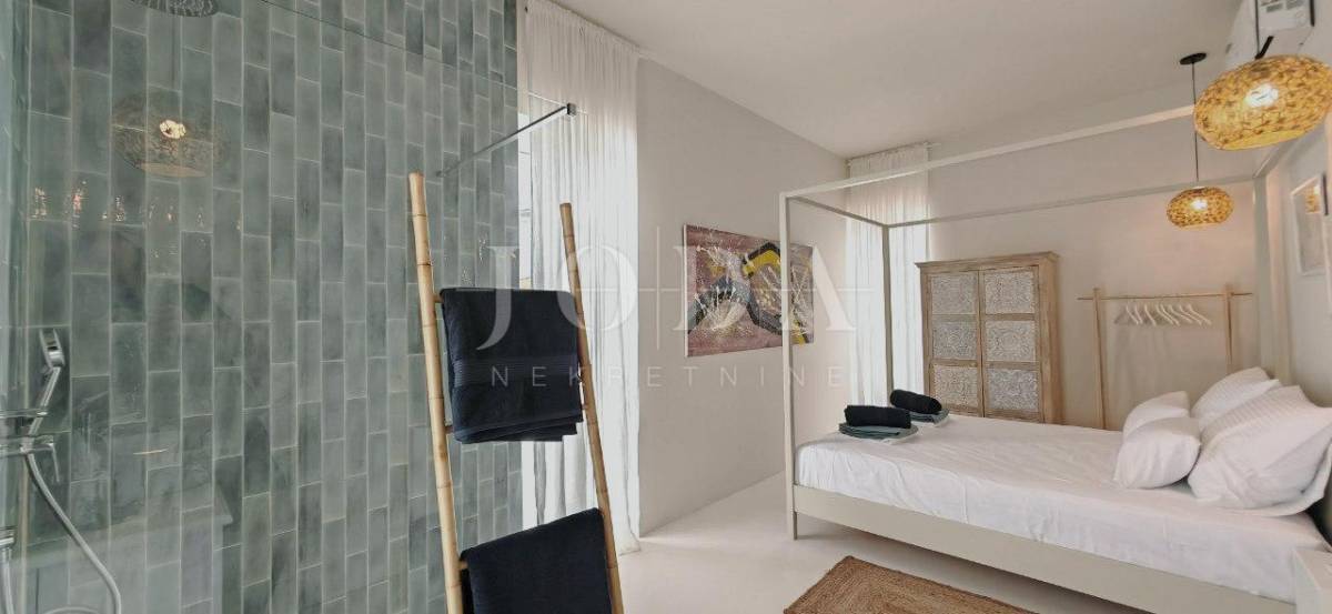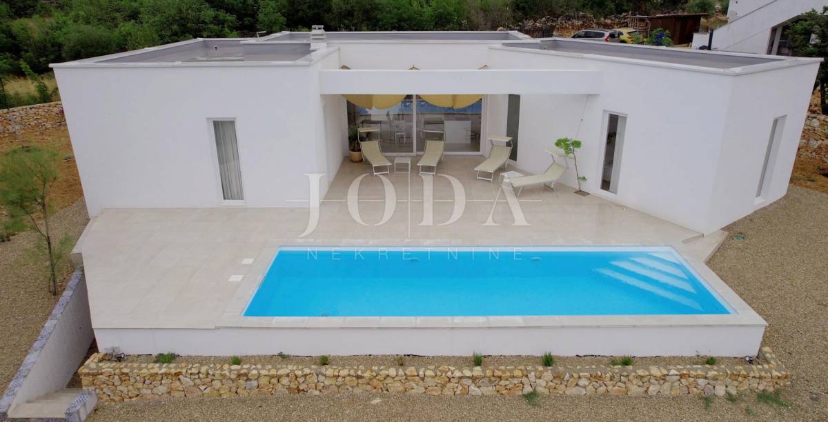 Samostojeća kuća neto stambene površine 111 m2 nalazi se na parceli od 700 m2. U centralnom dijelu kuće nalazi se prostrani dnevni boravak, kuhinja i blagovaonica s izlazom na natkrivenu terasu s jedne strane, a s druge je izlaz na sunčalište i bazen (10 x 3). U desnom krilu kuće nalazi se spavaća soba s vlastitom kupaonicom, toalet i spremište. U lijevom krilu nalaze se dvije spavaće sobe s vlastitim kupaonicama. Pri gradnji se koriste moderni materijali i oprema, kao što su kvalitetne keramičke pločice i sanitarije, ugrađena je PVC stolarija, protuprovalna vrata i podno grijanje, a postavljeni su i klima uređaji. Na raspolaganju su dva parkirna mjesta.