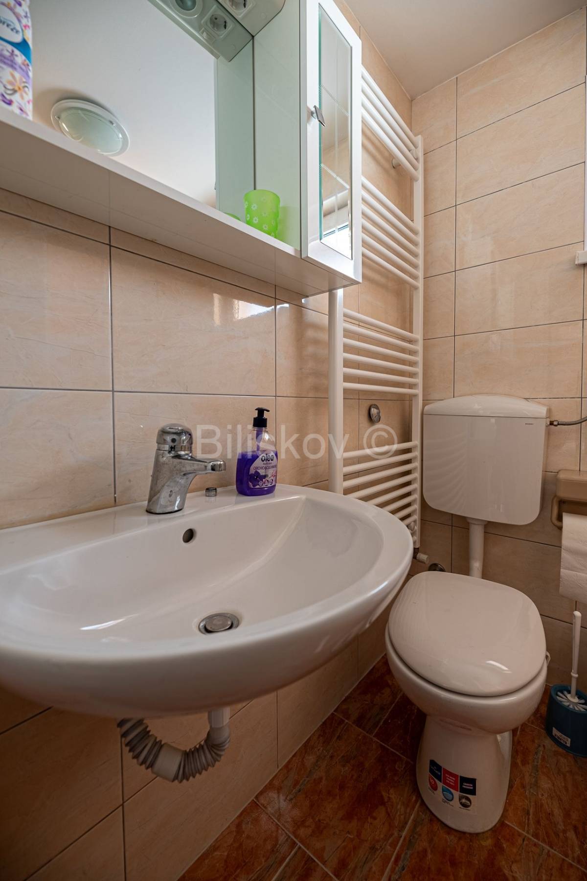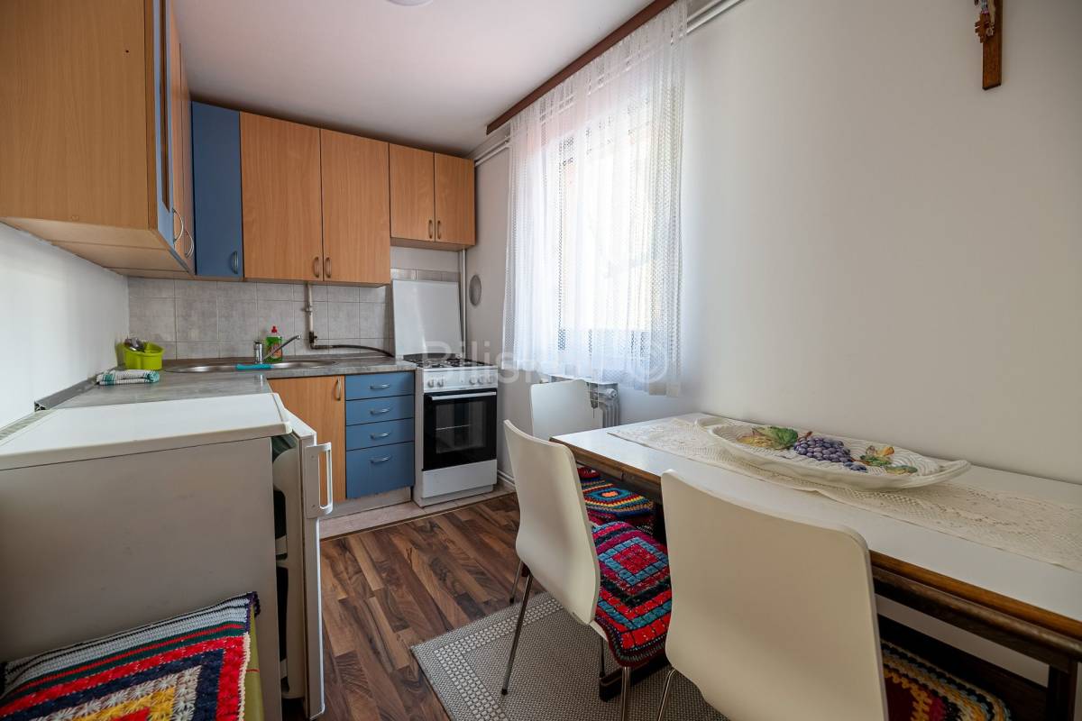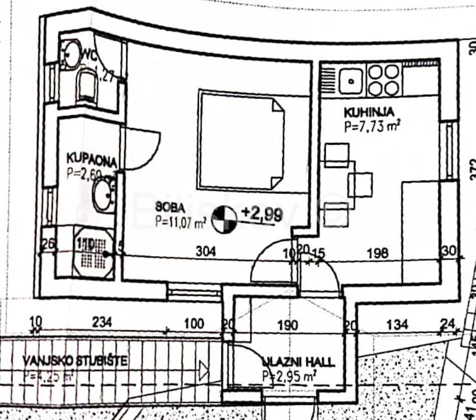 Stan na prvom katu se sastoji od kuhinje, blagovaone, sobe, kupaone i wc-a zasebno. Ukupno 35,24 m2.