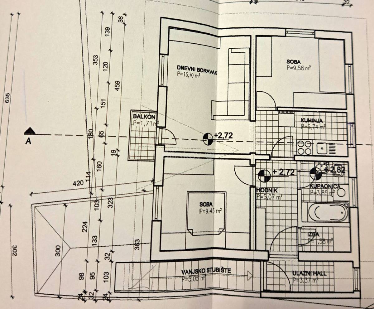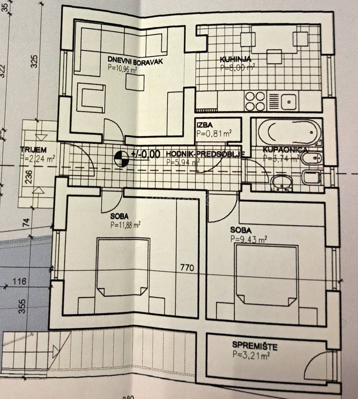 Stan na prvom katu se sastoji od predprostora, hodnika, dnevnog boravka i blagovaone, kuhinje, spremišta, balkona, dvije spavaće sobe i kupaonice. Ukupno 71,16 m2.