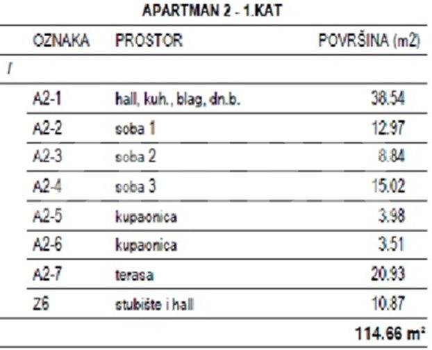 Apartman A2 se sastoji od ulaznog hodnika, dnevnog boravka s blagavaonicom i kuhinjim, tri spavaće sobe, dvije kupaonice i velike terasa, ukupne prodajne površine 115 m2 i jednog vanjskog parkirnog mjesta - cijena 516.000 eura