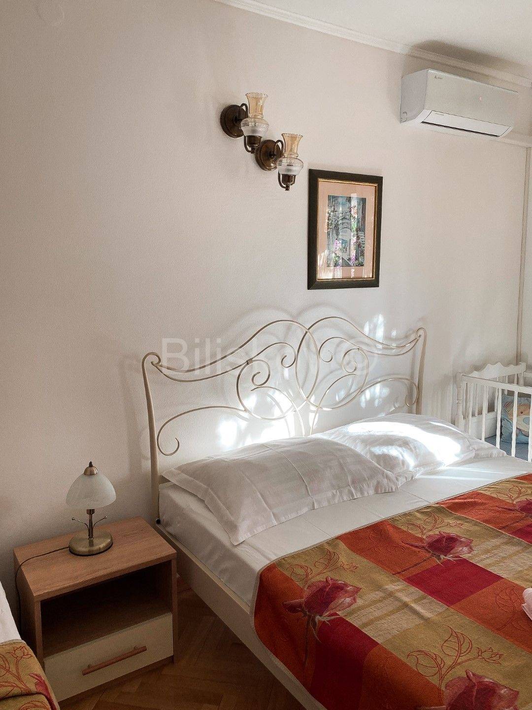 Kuća se sastoji od ukupno 6 apartmana.Prizemlje u potpunosti zauzima jedan prostrani apartman površine 125 m2 sa dva zasebna ulaza. Apartman ima potpuno opremljenu kuhinju, odvojenu blagovaonicu sa izlazom na terasu, kamin, dvije prostrane spavaće sobe, dvije kupaonice.Prvi kat ima zaseban ulaz. Na prvom katu nalaze se tri odvojena apartmana:Prvi apartman (jednosobni) površine 30 m2 ima veliku spavaću sobu, hodnik spojen sa kuhinjom i kupaonicu sa tuš kabinom. Prostrana terasa sa prekrasnim pogledom može se koristiti kao dodatni prostor za objedovanje. Drugi apartman (jednosobni) površine 30 m2 ima veliku spavaću sobu, mali hodnik spojen sa kuhinjom i kupaonicu sa tuš kabinom. Prostrana terasa.Treći apartman površine 45 m2 sastoji se od spavaće sobe i odvojene prostrane kuhinje, malog hodnika i kupaonice sa tuš kabinom. Ima dva balkona sa izlazima iz spavaće sobe ikuhinje.