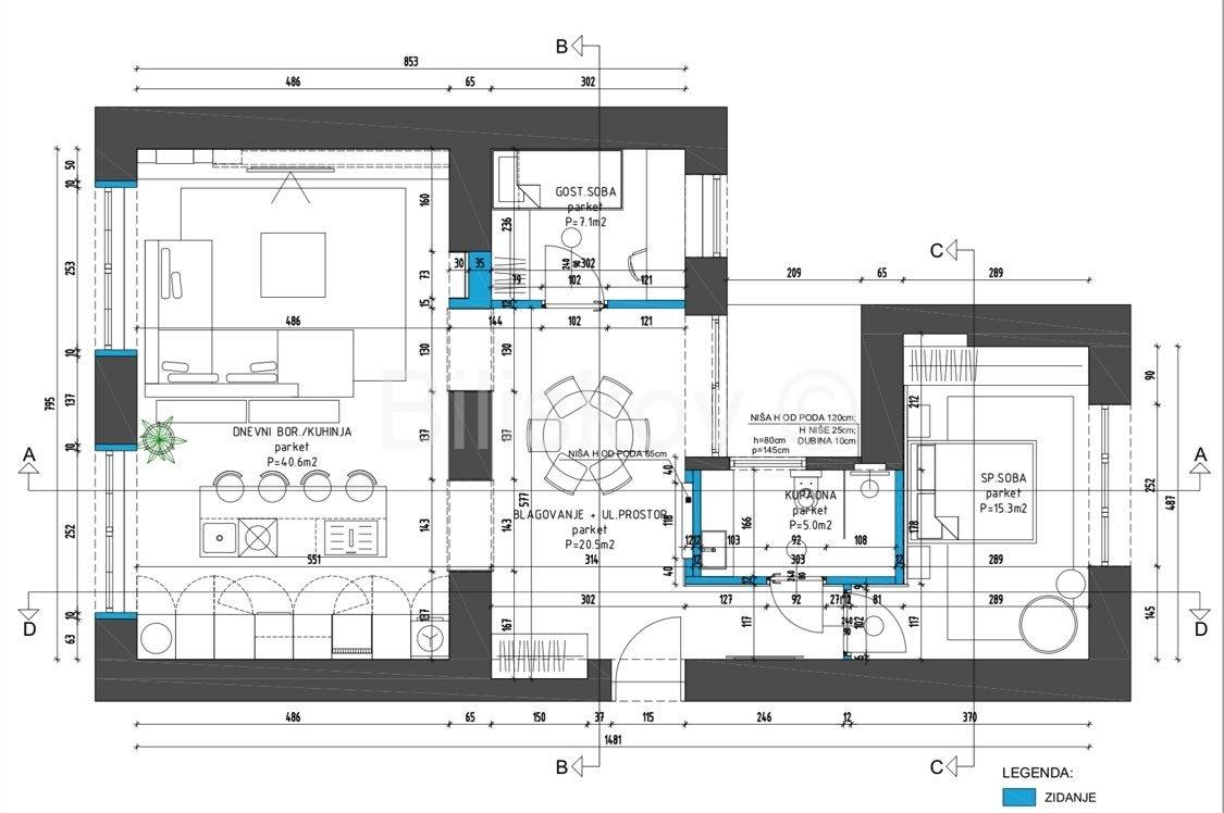 Stan je kompletno adaptiran i luksuzno uređen, a pri uređenju su korišteni vrhunski materijali i oprema, te dizajnerski namještaj.
