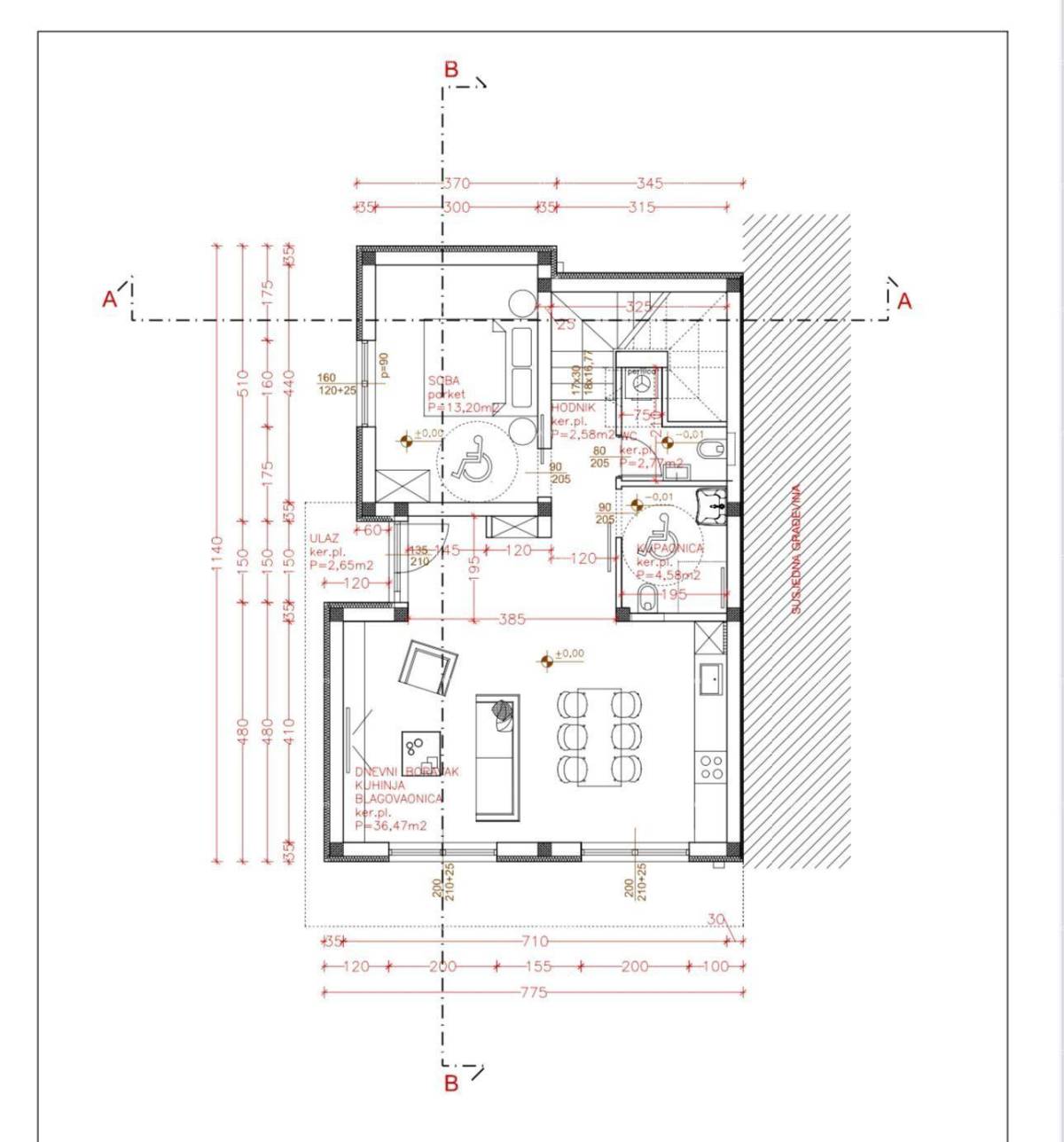 Prizemlje: prostrani dnevni boravak, jedna spavaća soba, kupaonica.