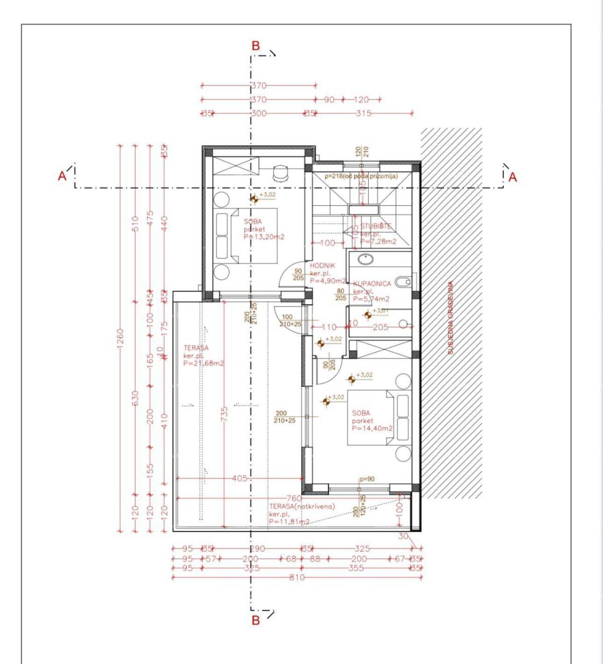 Prvi kat: dvije spavaće sobe, kupaonica, velika otvorena terasa od 20 m².