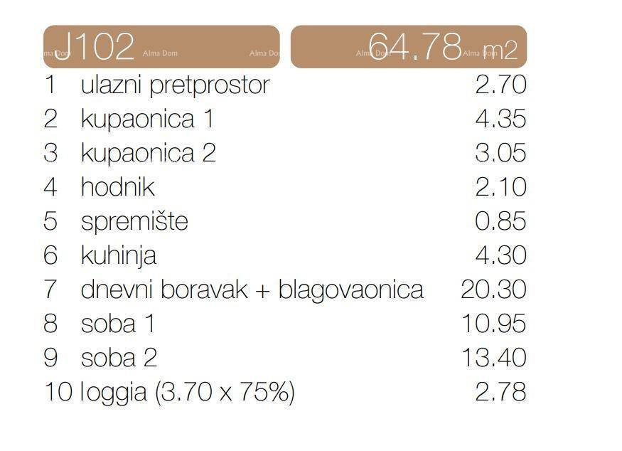 - (10) loggia: 3.70 m2 * koef. 0,75 = 2.78 m2