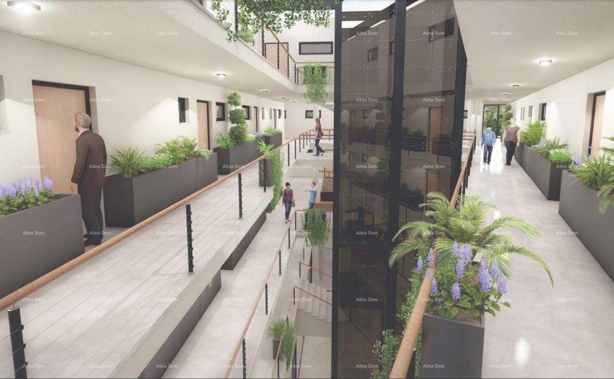 Zgrada stambeno-poslovne namjene, podijeljena je u tri jedinice, centralni, južni i sjeverni volumen. Ukupno će imati 78 stanova i 18 poslovnih jedinica. U objektu se nalazi bazen i podzemna garaža, gdje stanu pripada i garažno parkirno mjesto, uključeno u cijenu.