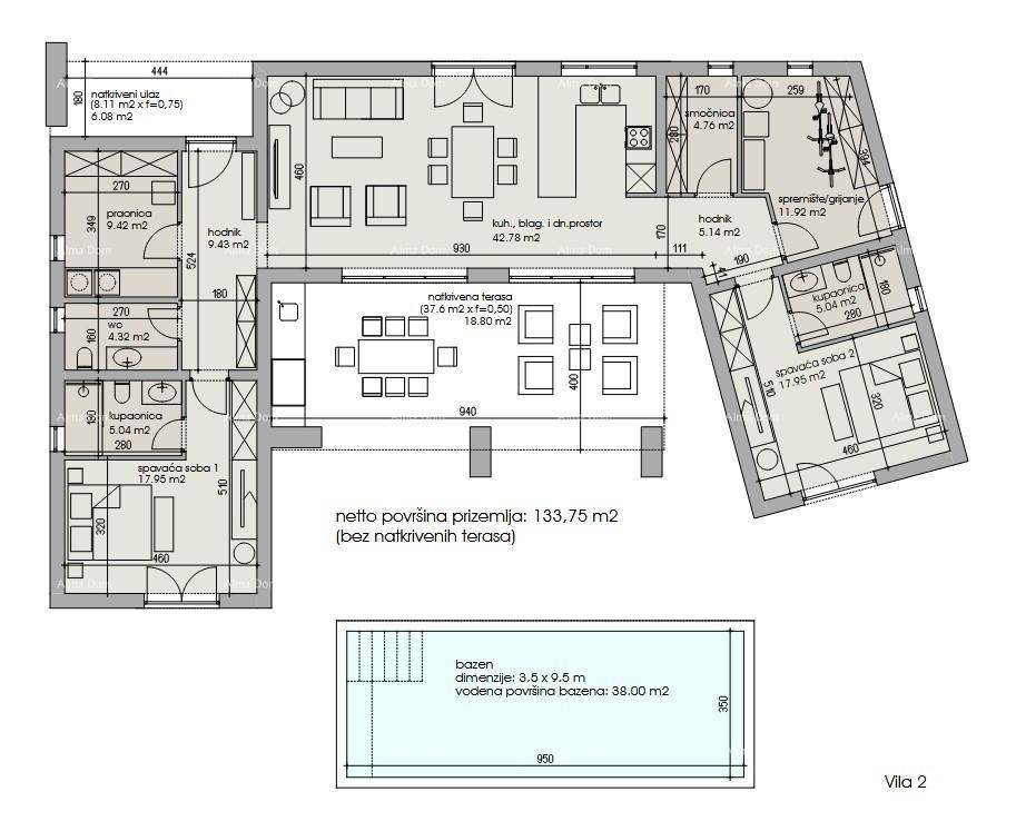 Planirana vila: 129 m² stambenog prostora, 38 m² natkrivene terase i 8 m² natkrivenog ulaza