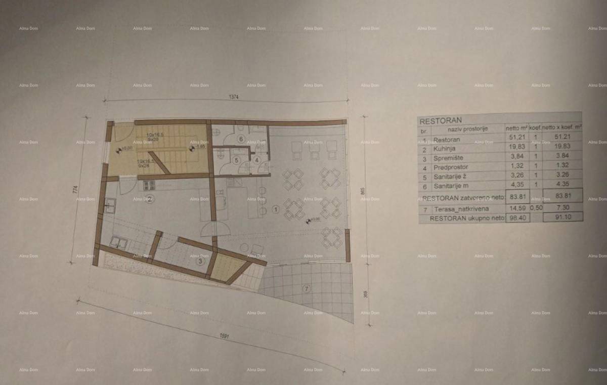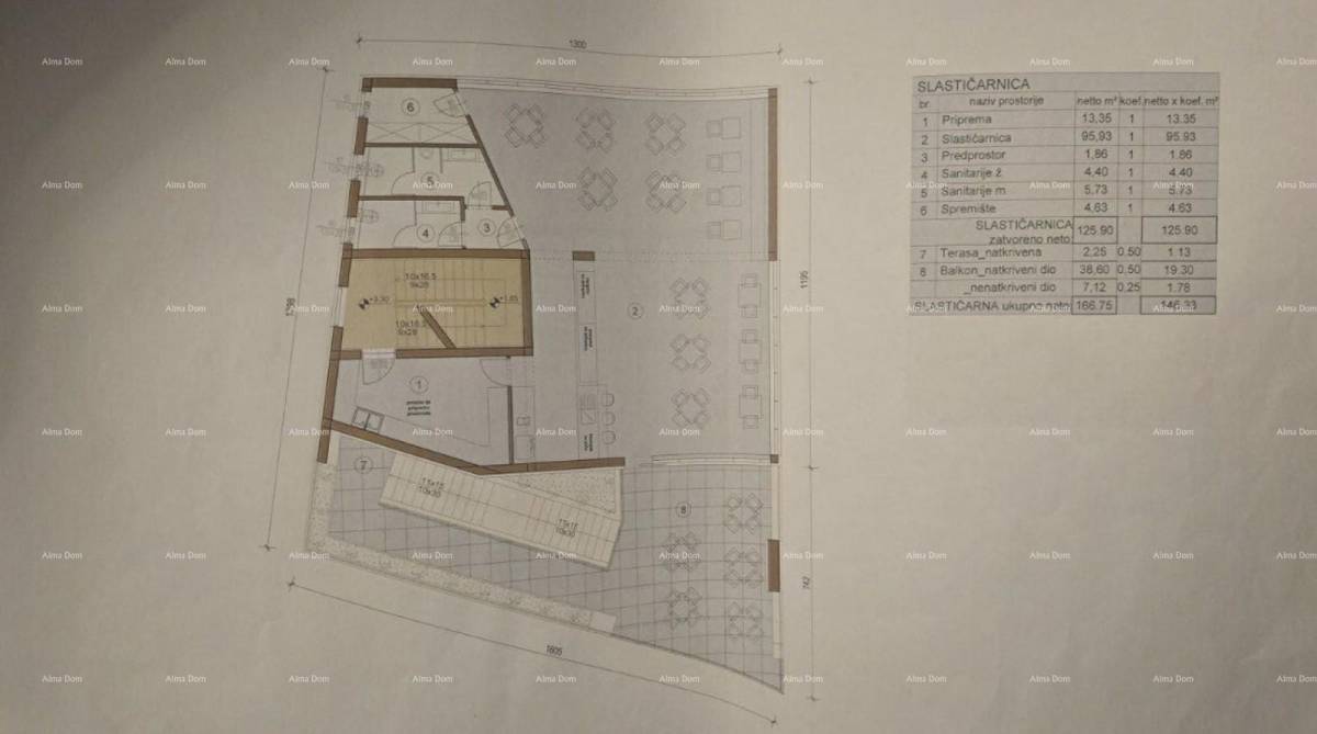 Projekt uključuje restoran ukupne površine 98,40 m² (netto 91,10 m²), slastičarna površine 166,75 m² (netto 146,33 m²) te stan veličine 170,15 m² (netto 138,72 m²).