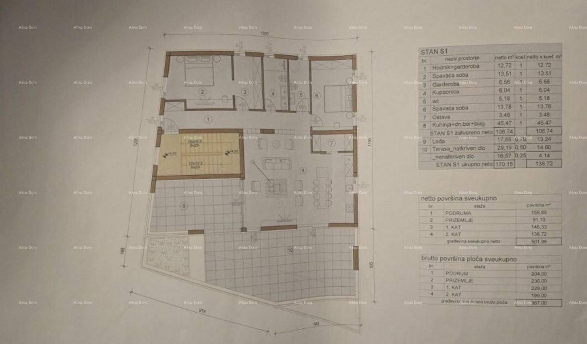 Projekt uključuje restoran ukupne površine 98,40 m² (netto 91,10 m²), slastičarna površine 166,75 m² (netto 146,33 m²) te stan veličine 170,15 m² (netto 138,72 m²).