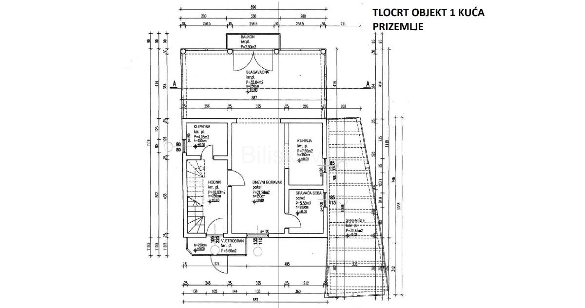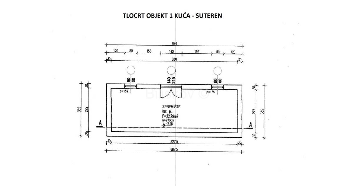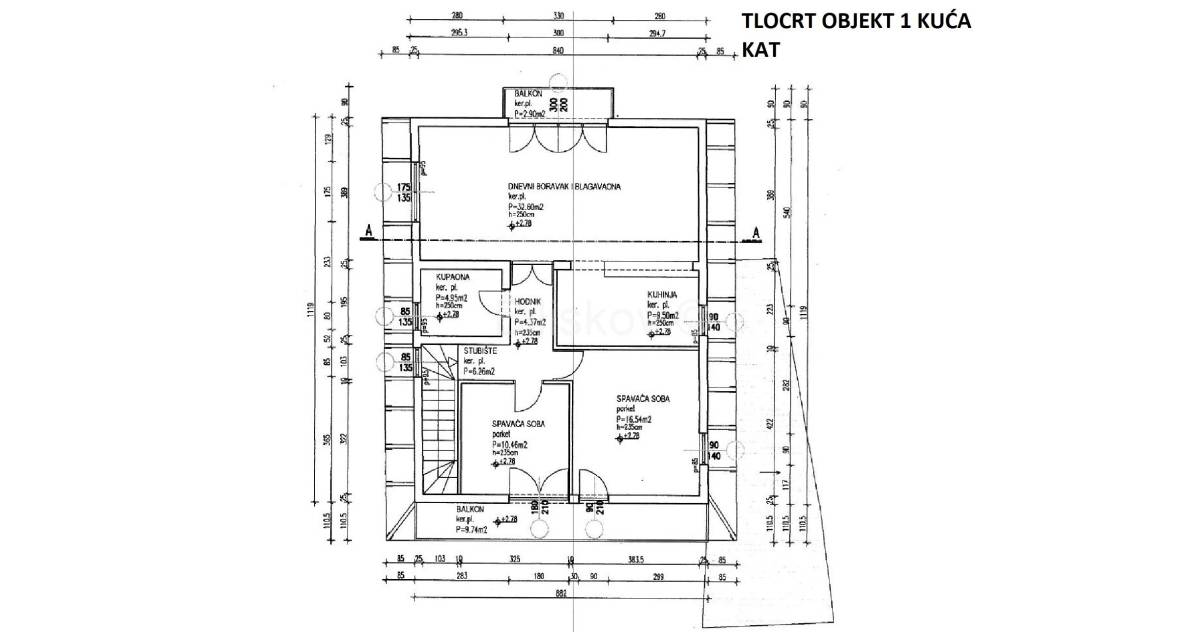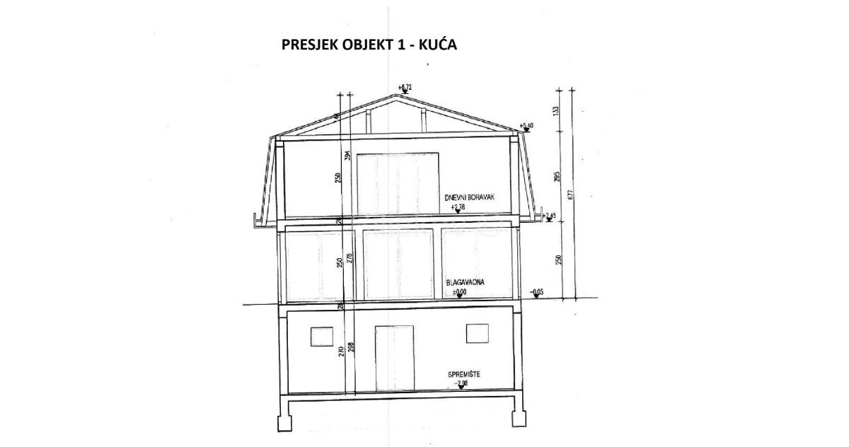 Građevni objekt 1 je stambena kuća ukupne bruto površine 254 m2, a sastoji se od suterena, prizemlja i kata. Kuća raspolaže s dva spremišta, dvije kuhinje, dva dnevna boravka, dvije blagovaonice, dvije kupaonice s wc-om, tri spavaće sobe, tri balkona i dvije terase.