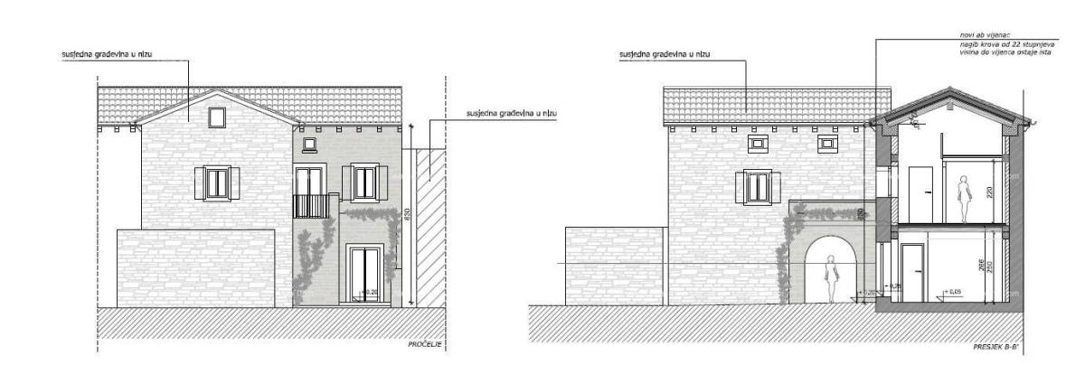 Projektom rekonstrukcije predviđena je izgradnja obiteljske kuće na tri etaže (prizemlje + kat + potkrovlje), s jednom stambenom jedinicom i pristupom iz prizemlja sa zapadne strane.