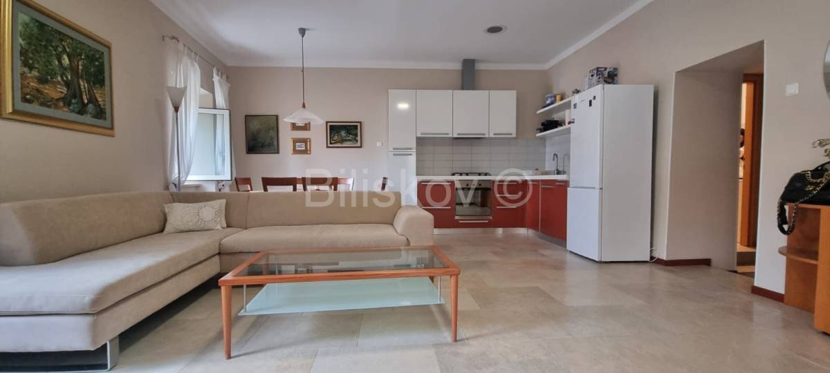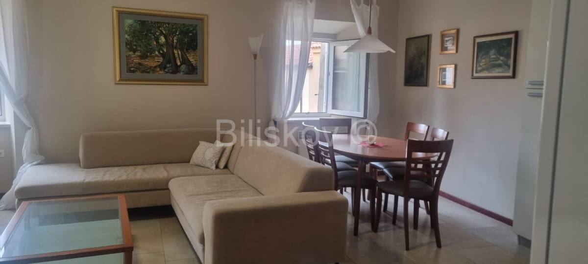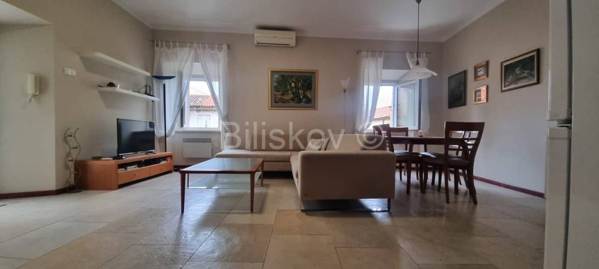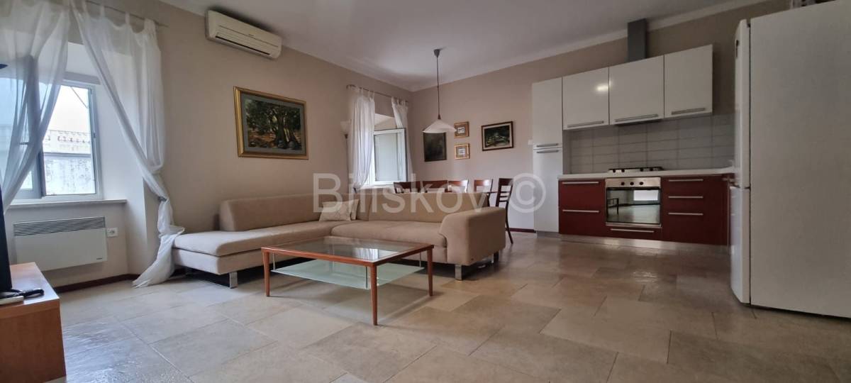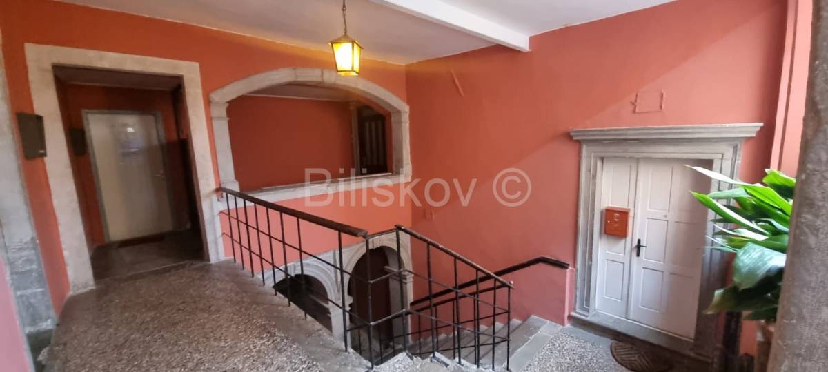 Prostran i namješten trosoban stan ukupne površine 75,66 m2 smjestio se na prvom katu starije kamene zgrade sagrađene oko 1800. godine.