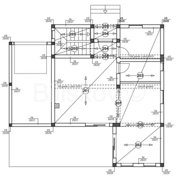 Na katu kuće se nalazi hodnik, dvije spavaće sobe i dvije kupaonice te terasa.