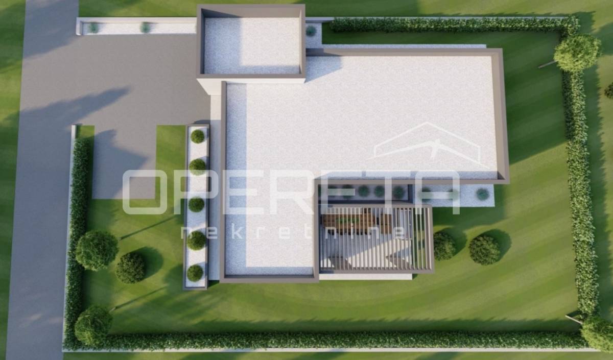 Orjentirana na sve 4 strane svijeta, funkcionalnog tlocrta i rasporeda, sastoji se od "open space" dnevnog boravka / blagovaonice / kuhinje s izlazom na prostranu terasu s pogledom na prirodu i zelenilo, "master" spavaće sobe s kupaonicom i "walk in" ormarom, dvije spavaće/radne sobe, dodatne kupaonice s wc-om, zasebnog wc-a, 2 spremišta, hodnika i garaže.