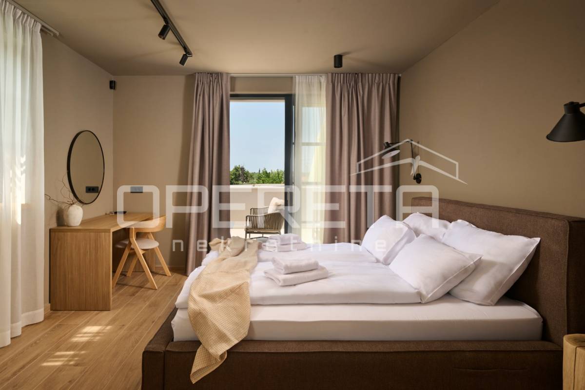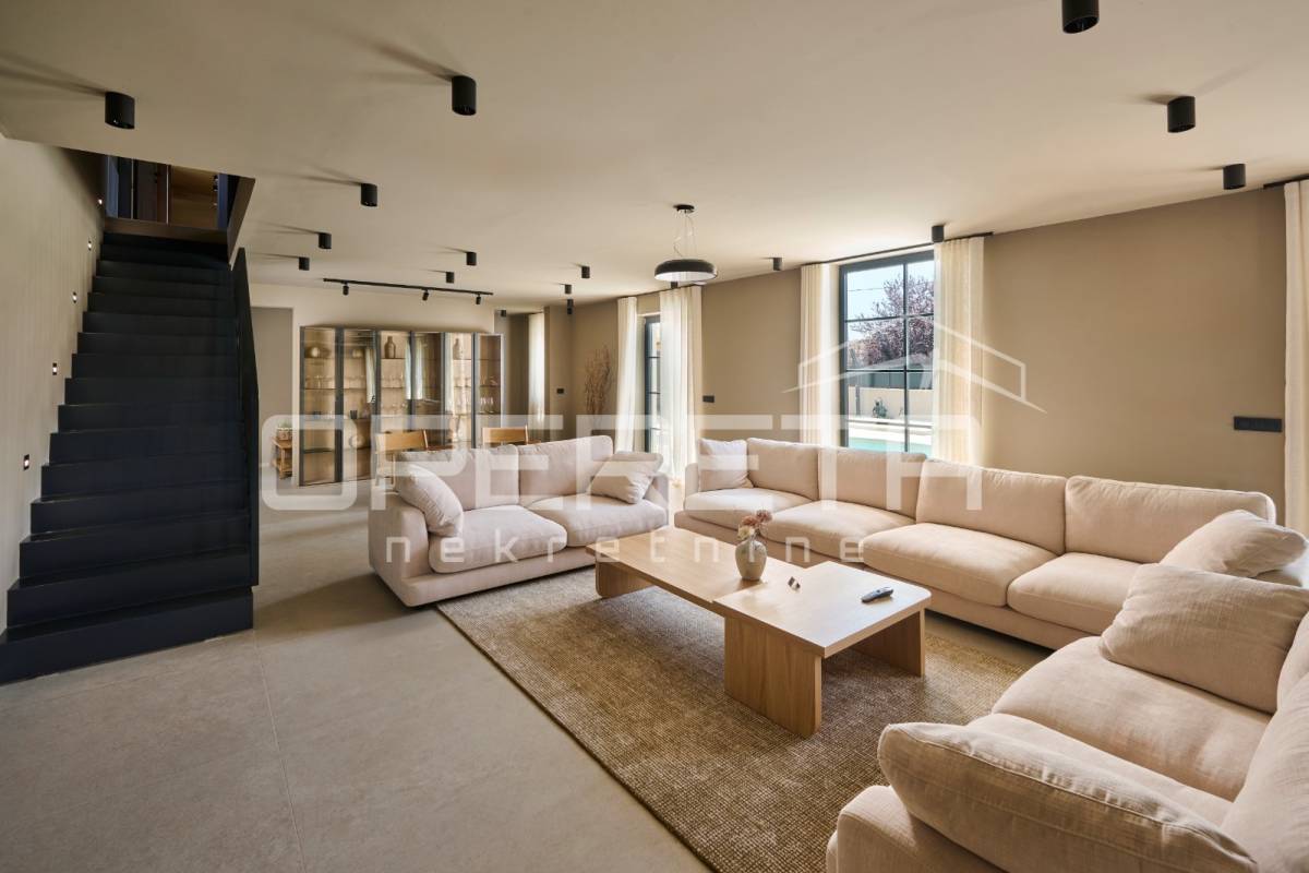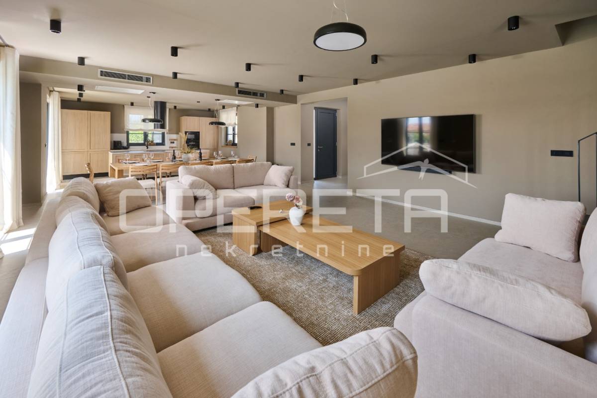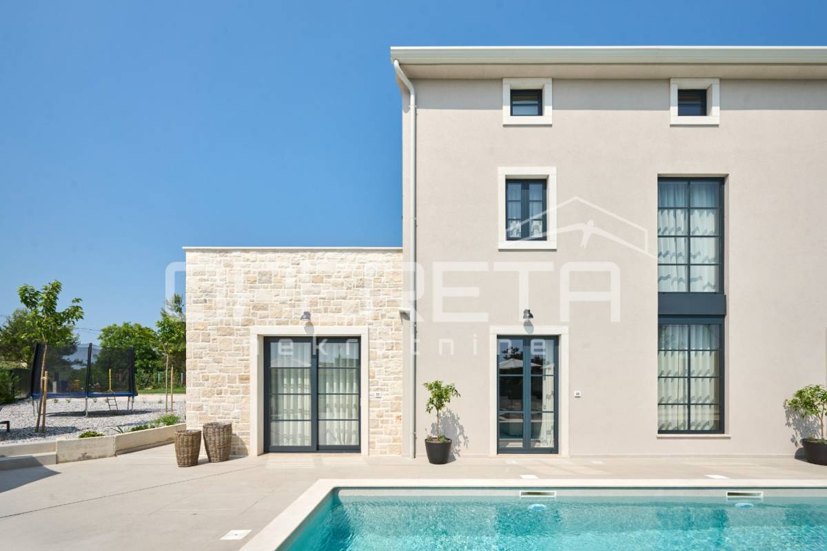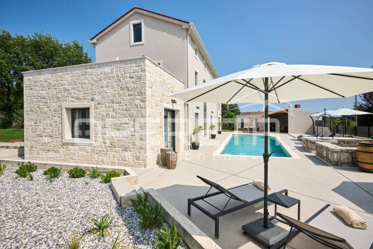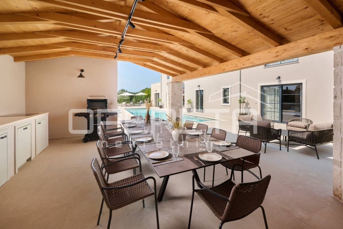 Eksterijer vile jednako je impresivan. Dominira veliki bazen dimenzija 15,5 x 5 m, uz koji se prostire prostrano sunčalište i vanjska kuhinja, savršena za ljetna druženja. Pored kuće nalazi se i pomoćni objekt od 70 m² sa pregršt mogučnosti i potpuno opremljena ljetna kuhinja s velikim stolom za 12 osoba, idealna za zabavu i opuštanje.