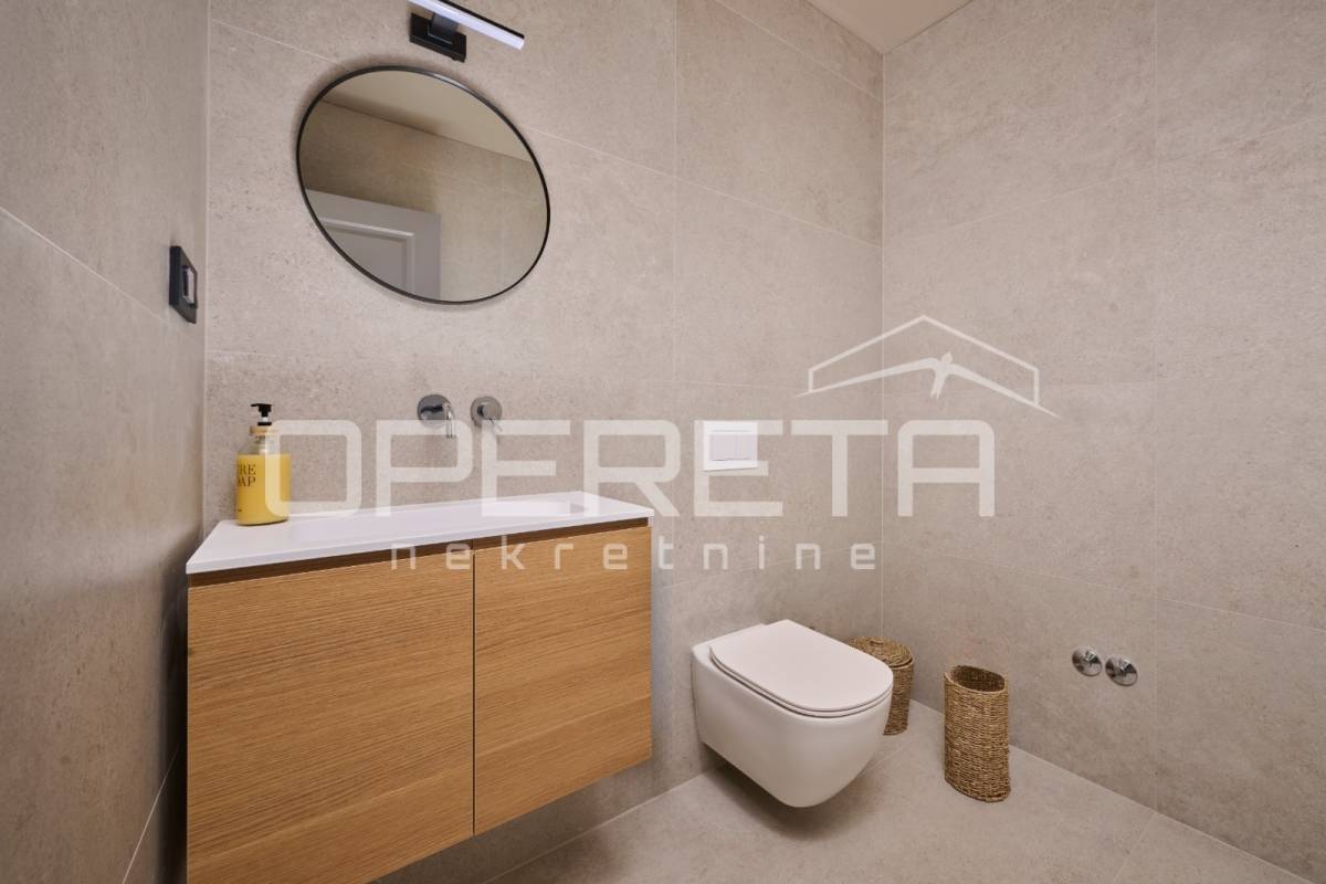 U prizemlju, površine 154 m², nalazi se elegantan ulazni predprostor, garderoba, tehnička soba, gostinjski WC te moderno osmišljen open-space prostor s kuhinjom, blagovaonicom i prostranim dnevnim boravkom s direktnim izlazom na vanjsku terasu. Ovdje je smještena i jedna spavaća soba s vlastitom kupaonicom.