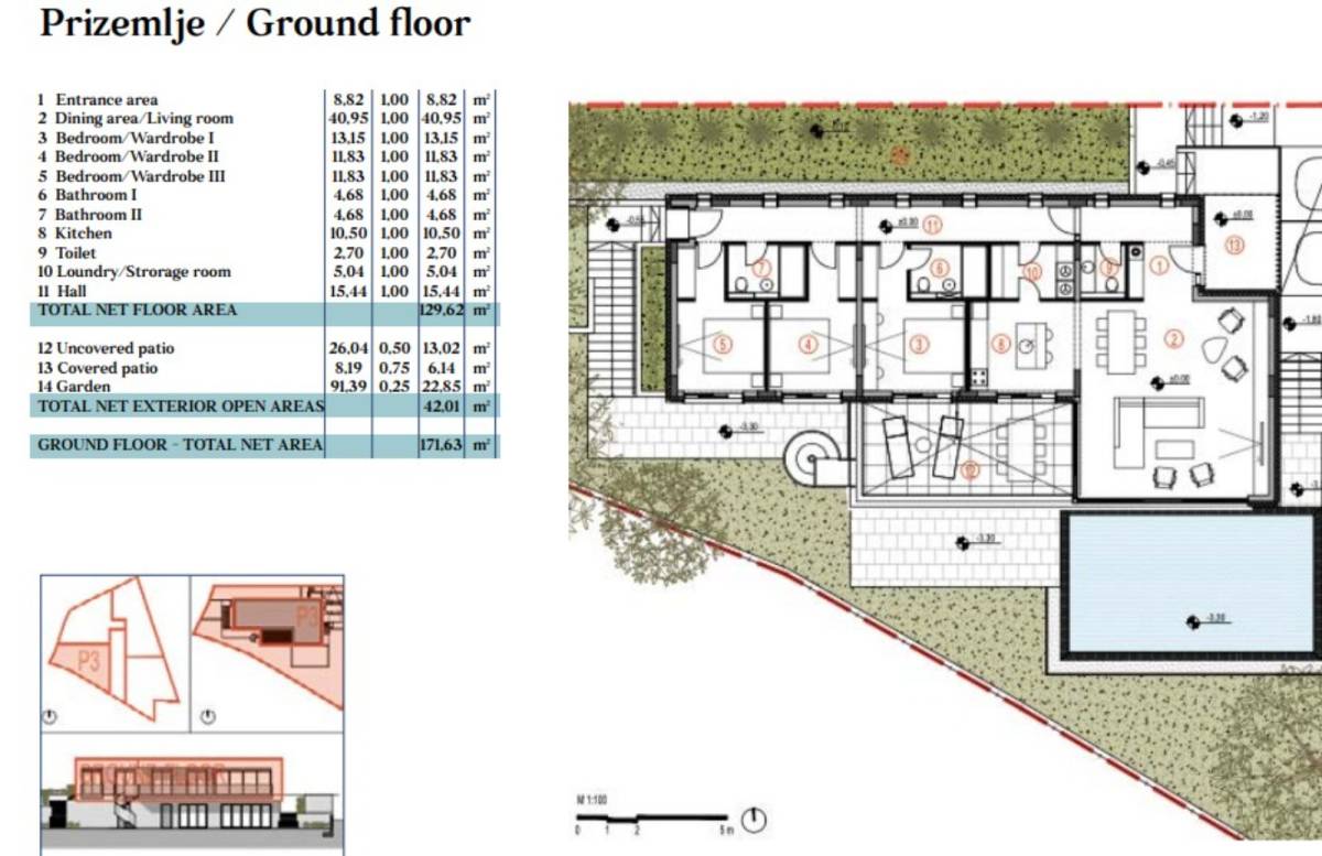 Veličine 392 m2 na atraktivnoj lokaciji 80 metara od mora. Smještena u vrlo mirnom okruženju u vlastitoj slijepoj ulici bez prometa.
