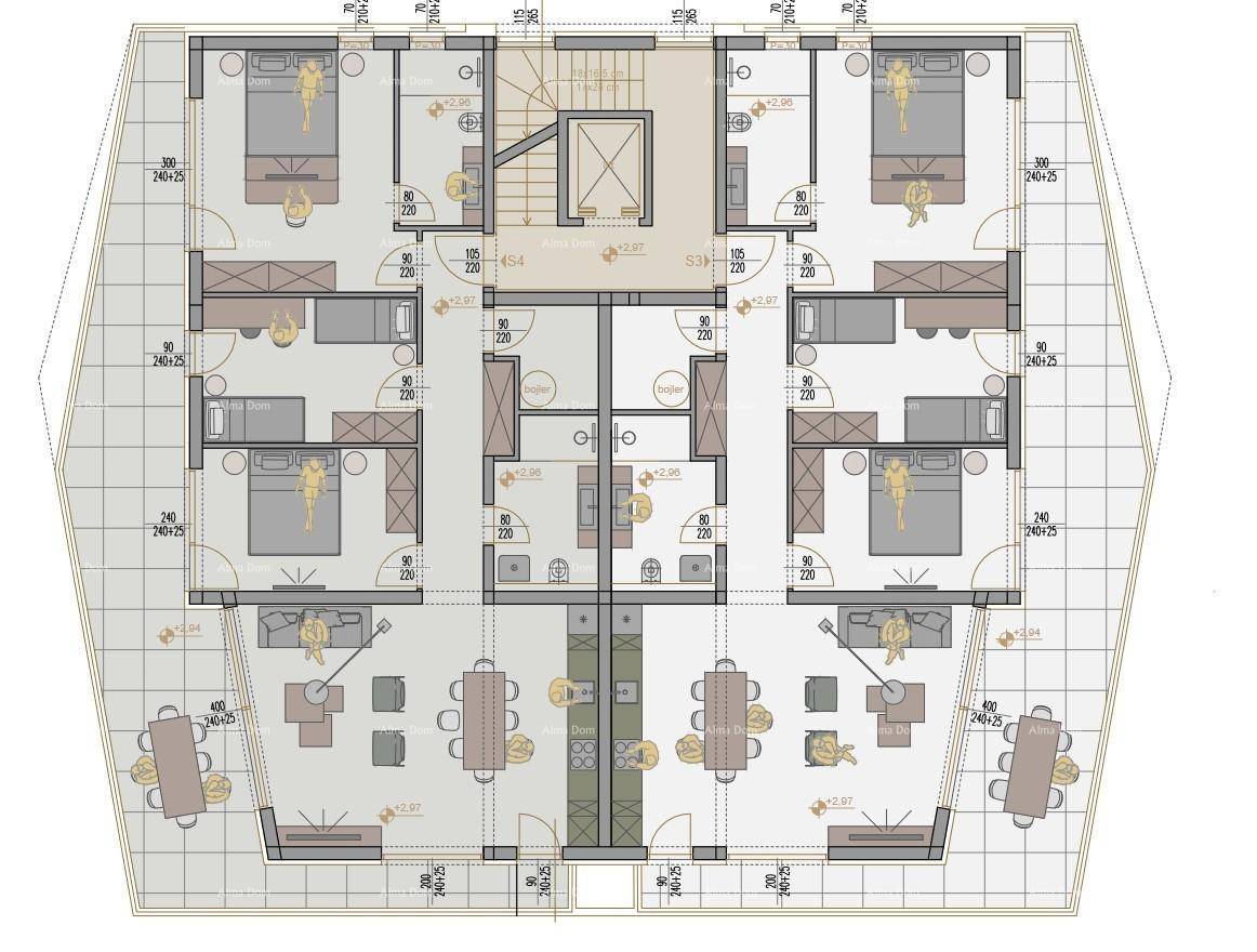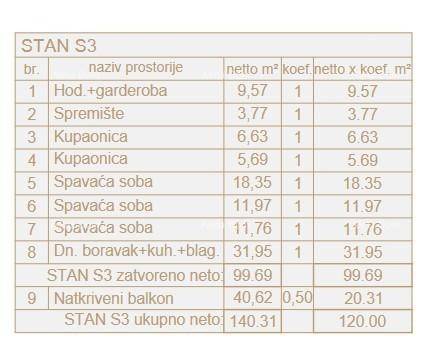 Stan S3, nalazi se na 1.katu zgrade A, površine 141.31 m2 (neto površine 120 m2) i sastoji od: hodnika s garderobom, spremišta, 3 spavaće sobe, 2 kupaone, dnevnog boravka s kuhinjom i blagovaonom te prostranog naktrivenog balkona kojem se pristupa iz svih soba, te s kojeg se pruža pogled na more.