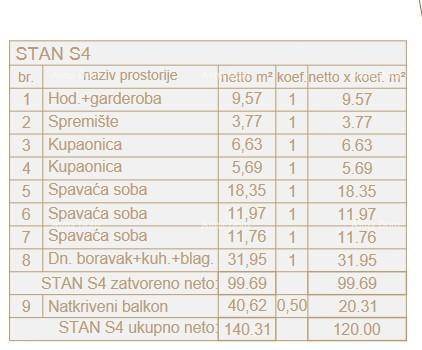 Stan S4, nalazi se na 1.katu zgrade A, površine 141.31 m2 (neto površine 120 m2) i sastoji od: hodnika s garderobom, spremišta, 3 spavaće sobe, 2 kupaone, dnevnog boravka s kuhinjom i blagovaonom te prostranog naktrivenog balkona kojem se pristupa iz svih soba, te s kojeg se pruža pogled na more.