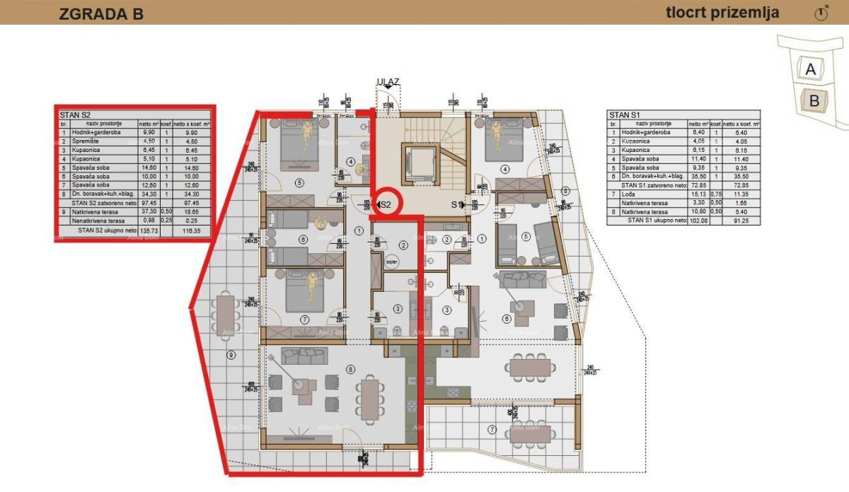 Stan S2, nalazi se u prizemlju zgrade B, površine 135.73m2 (neto površine 116.35 m2) i sastoji se od: hodnika s garderobom, spremišta, 3 spavaće sobe, 2 kupaone, dnevnog boravka s kuhinjom i blagovaonom te prostrane natkrivene terase, kojoj se pristupa iz svih soba, te s koje se pruža pogled na more.