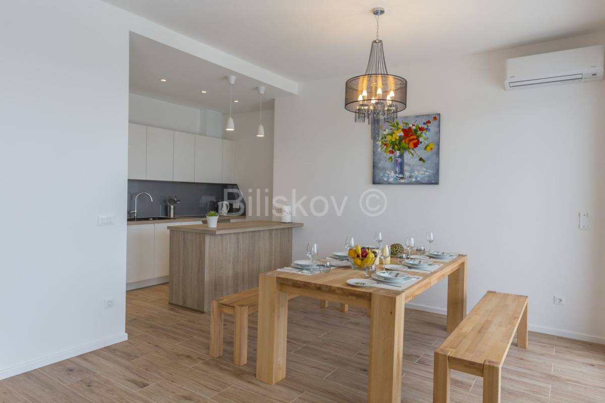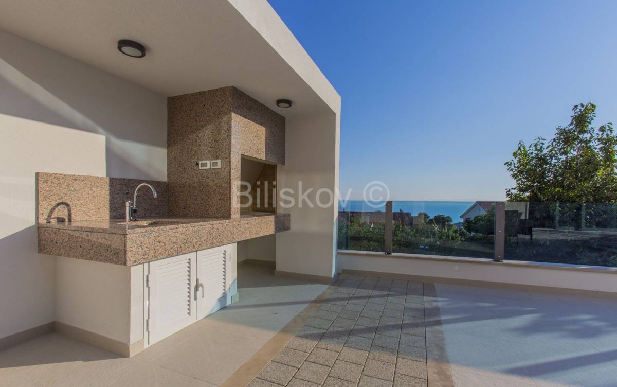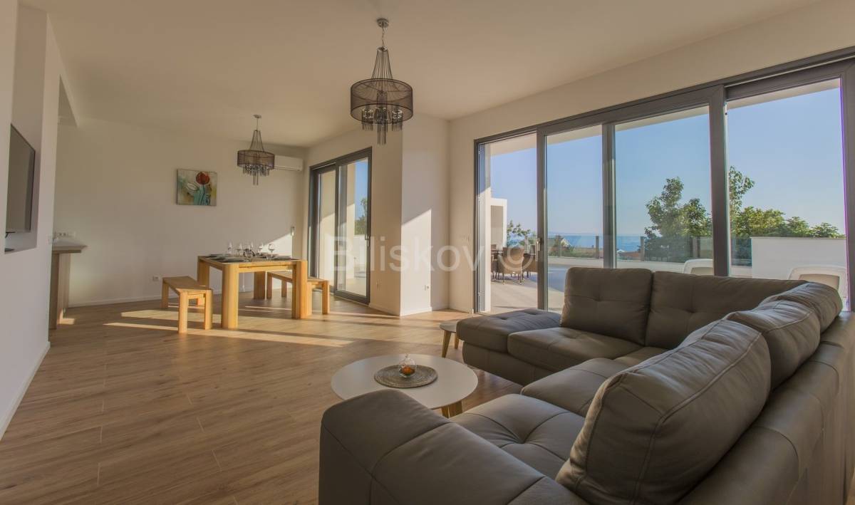 Prizemlje vile također sadrži drugi, jednako velik i uređen dnevni boravak s kuhinjom iz kojih se izlazi na terasu s predivnim pogledom na more i otoke te kupaonicu sa tuš kabinom.