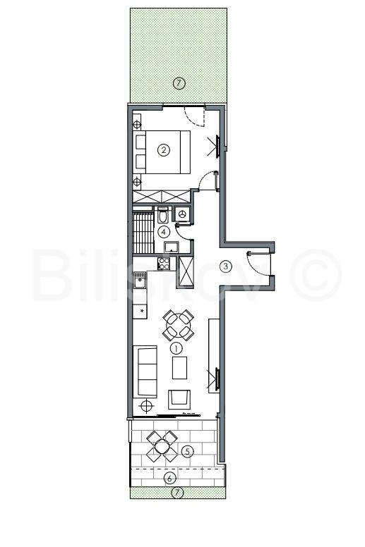 Ovaj prekrasni stan sastoji se od dnevnog boravka sa kuhinjom i blagavaonicom, spavaće sobe, hodnika, lođe, terase i vrta.
