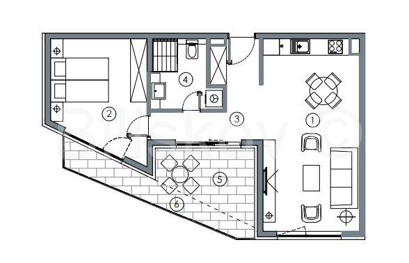 Ovaj prekrasni stan sastoji se od dnevnog boravka sa kuhinjom i blagovaonicom, spavaće sobe, kupaonice, hodnika, lođe i balkona.