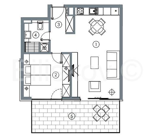 Ovaj prekrasni stan sastoji se od dnevnog boravka sa kuhinjom i blagavaonicom, spavaće sobe, hodnika i balkona.