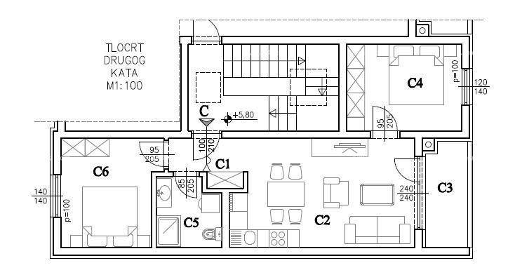 Stan C-C nalazi se na drugom katu zgrade C i obuhvaća ukupnu površinu od 59,64 m², uključujući stambeni dio, lođu, garažno parkirno mjesto i spremište.